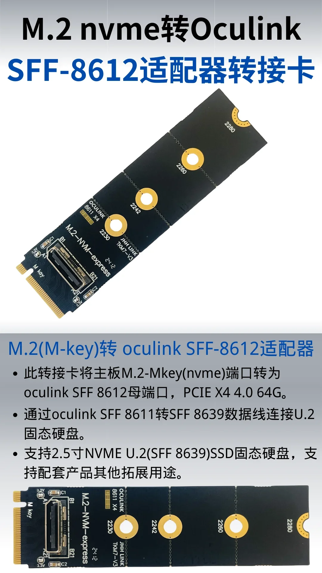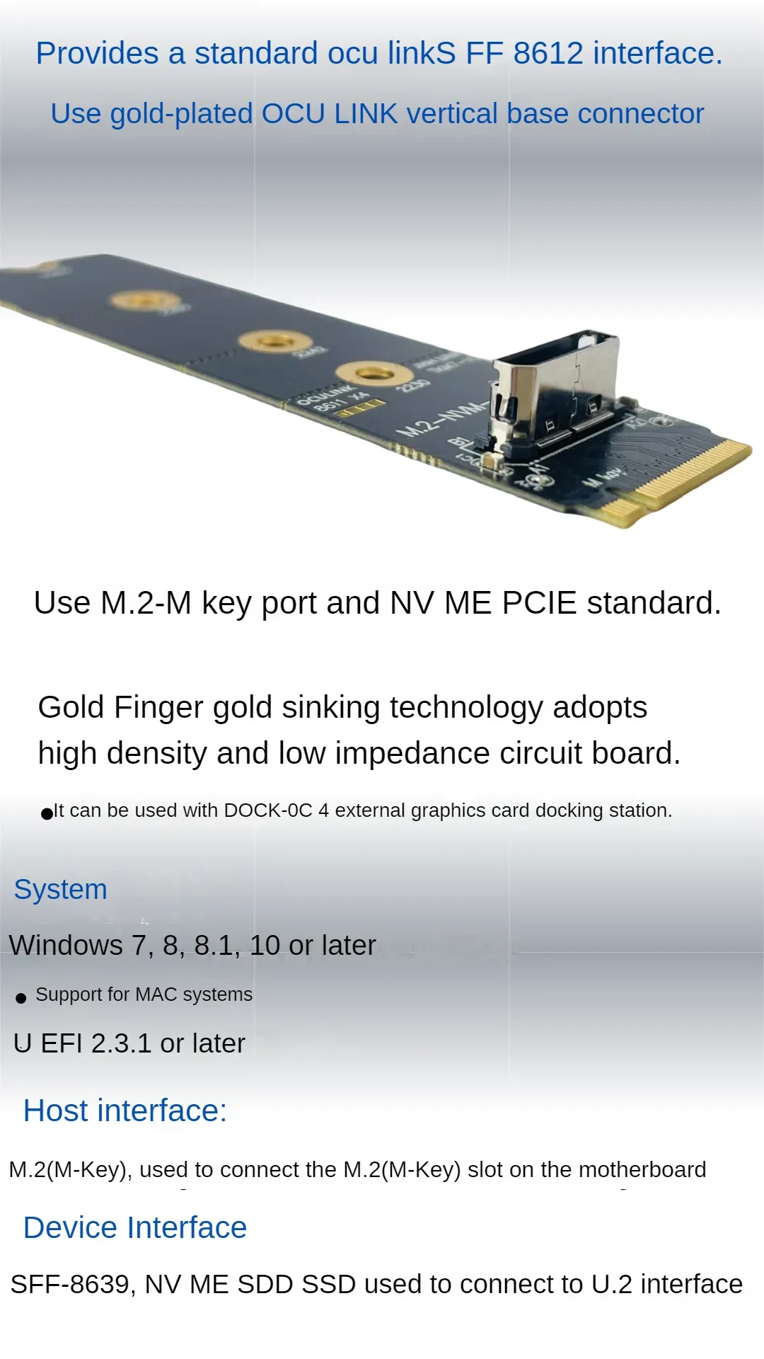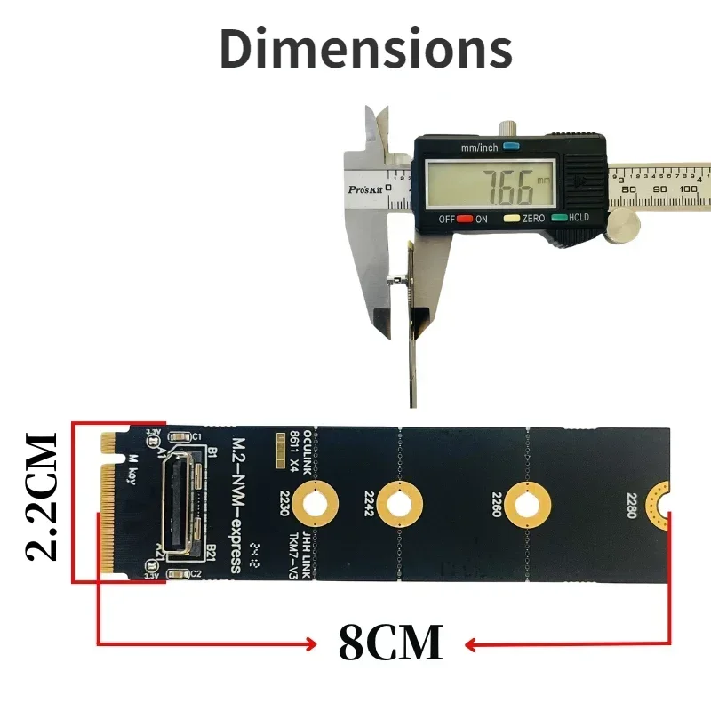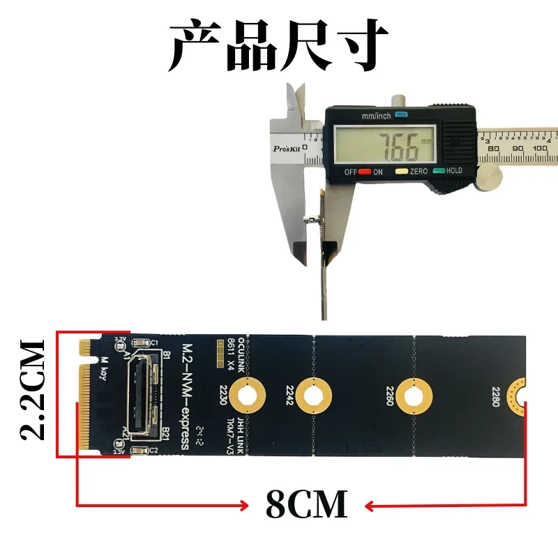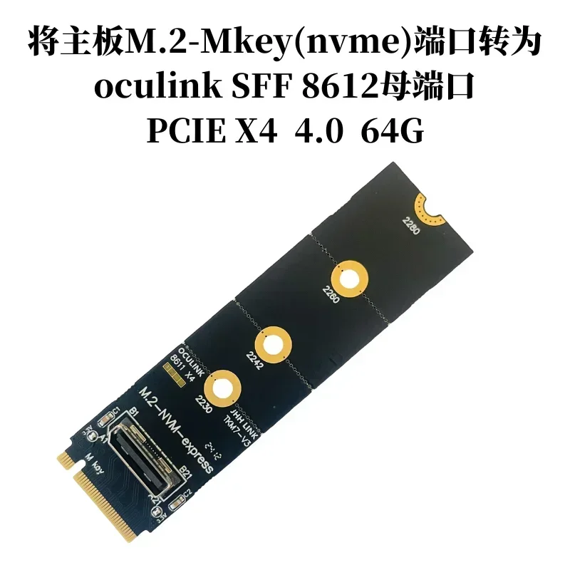 1.Este adaptador convierte el puerto M.2-Mkey (NVMe) de la placa base en el puerto hembra oculink SFF 8612, PCIE X4 4,0 64Gbps.