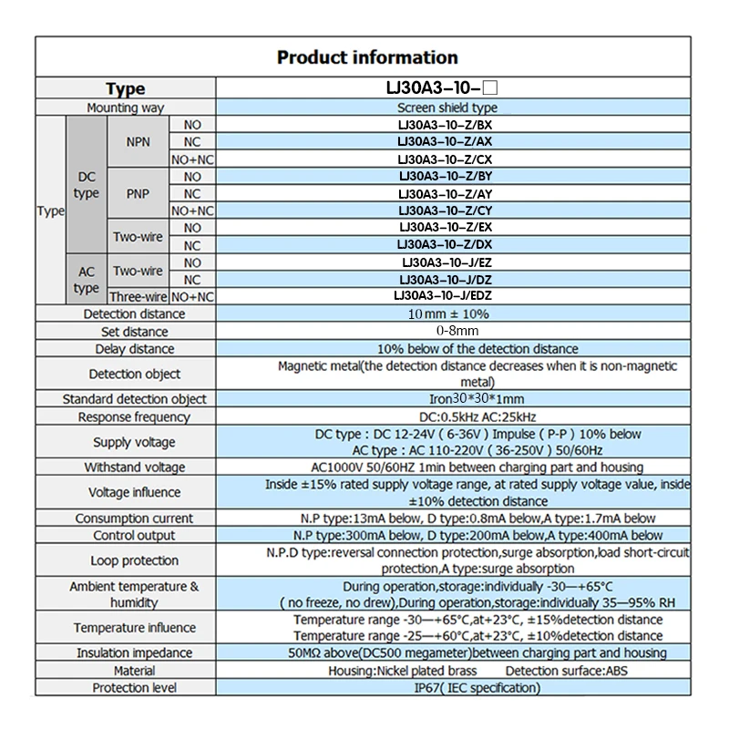 LJ30-10-Z/AX: DC NPN 3 cables Normalmente cerrado 30 mm de diámetro; Distancia de detección de 10 mm