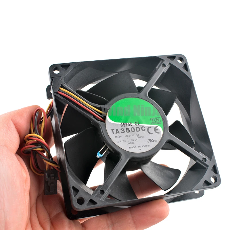 Modelo: TA350DC/M35172-57 G3DELCaracterísticas: sonda de control de temperatura (ajusta automáticamente la velocidad)Tamaño: 92x92x32mm (90x90x32mm)Rodamiento: doble bolaVoltaje: 12VCorriente: 0,55 AVelocidad: control de velocidad automático de 1300 ~ 3600 RPMVolumen de aire: 24,2 ~ 68,23 CFMRuido: 16~427,7 dBANota: Aunque es de 0,55 A, no alcanza este valor en horarios normales.Si se requiere alta velocidad, los dos pies del componente de control de temperatura están en cortocircuito; es decir, las dos patas están conectadas, el ventilador funciona a máxima velocidad, la velocidad de rotación es alta, el volumen de aire es grande y el El sonido también es GrandeReferencia de control de temperatura:Estado bajo: a una temperatura ambiente de 25 grados, la velocidad se encuentra automáticamente a 1300 rpm, el volumen de aire es de 24,30 CFM y el valor de ruido es de 16,5 dB.Estado alto: cuando la temperatura ambiente es de hasta 55 grados, la velocidad es de 3600 rpm, el volumen de aire es de 68,23 CFM y el valor de ruido es de 42,7 dB.Otros estados: Bajo diferentes temperaturas ambiente, según la sonda de control de temperatura, la velocidad se ajusta automáticamente y el ventilador tiene una velocidad correspondiente automática.
