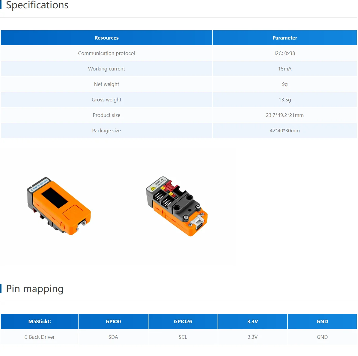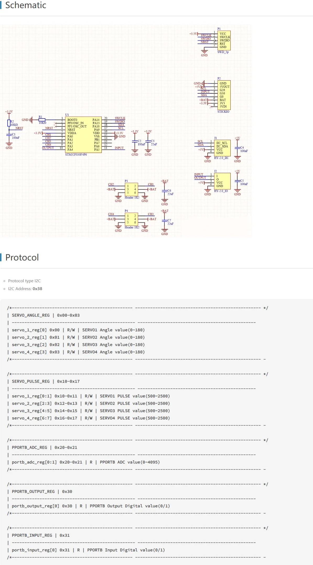 C Back Driver is a steering gear drive board compatible with M5StickC. It adopts STM32F030F4P6 control scheme, uses I2C communication interface to communicate with M5StickC, and provides 4 sets of PWM steering gear drive interfaces (the drive power of the steering gear is directly connected to the M5StickC The internal battery can drive general specifications of the steering gear, such as: SG90, etc.). This module leads the I2C bus at the top of StickC and provides an additional GPIO interface through STM32 expansion. It can be used for general logic level and ADC analog signal input reading. With the LEGO compatible hole design on the back, users can easily integrate this driver board into the LEGO building block structure, which can be used to build controllable structures such as steering gear manipulators.
