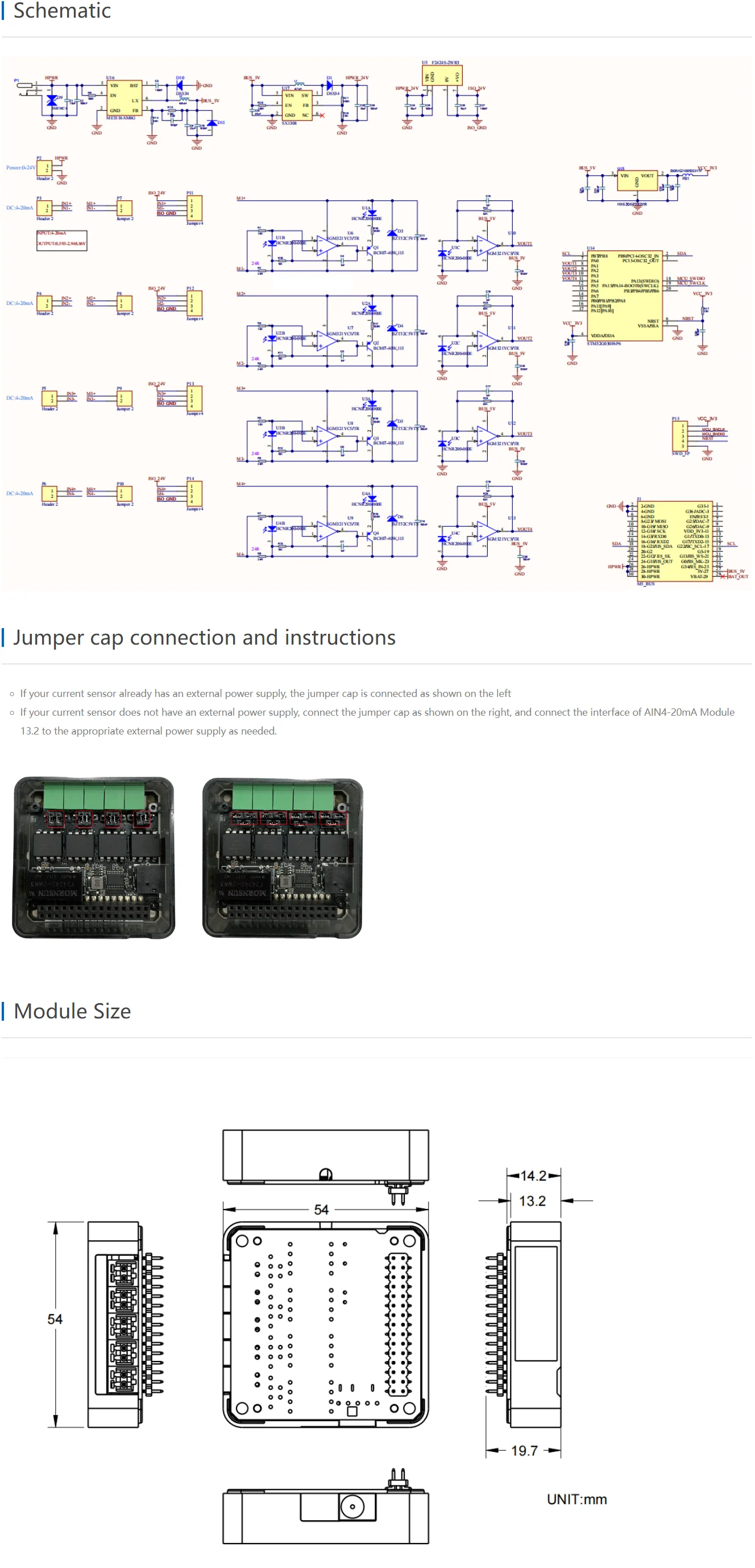 El módulo AIN4-20mA 13.2 es un módulo de adquisición analógica de corriente de cuatro canales de 4 ~ 20 mA.Adopta el chip de control principal STM32G030F6 y un chip de adquisición dedicado con aislamiento para comunicarse con el host M5 para la comunicación i2c.Admite cambiar a cableado alimentado internamente o externamente mediante tapas de puente.El chip de aislamiento de energía integrado y el circuito de amplificador operacional incorporado miden con precisión los sensores de corriente externos y garantizan la precisión de la señal y la seguridad del sistema.En términos de suministro de energía, la interfaz DC-JACK y el correspondiente circuito de refuerzo DC-DC pueden proporcionar energía a todo el dispositivo.'Adecuado para monitoreo de equipos de sistemas de energía, control de motores, gestión y automatización de energía y control de procesos industriales".