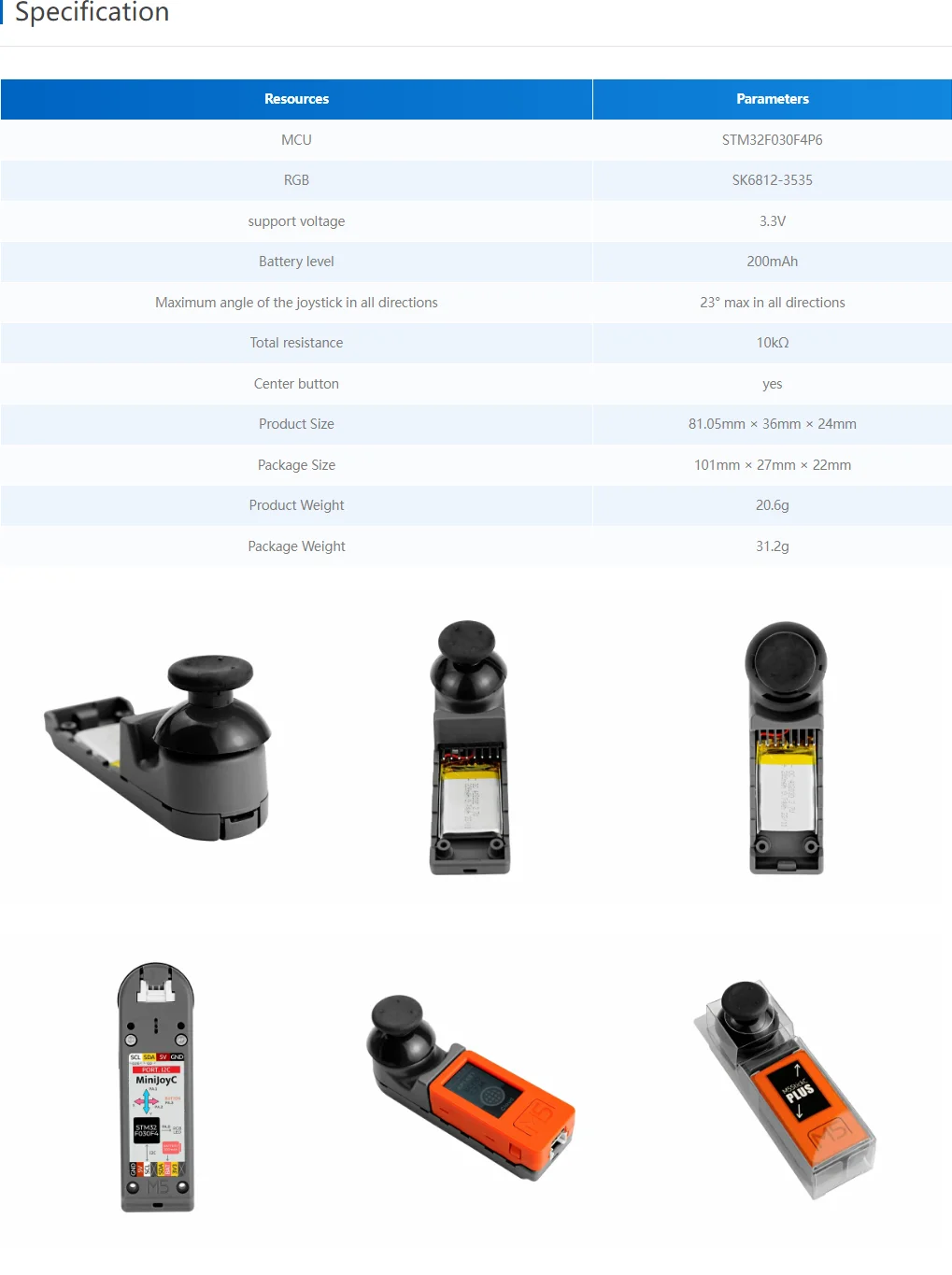 MiniJoyC HATis a 'joystick controller expansion base' used withM5StickC/C-CPlus, which integrates XY axis joystick, 'with button' function, and comes withI2C HY2.0standard interface to facilitate the expansion of other components; Containing200mAh lithium polymer batteryand oneSK6812 RGB LED. This product can be used for remote control of drones or trolleys and remote control of robot joints, etc.