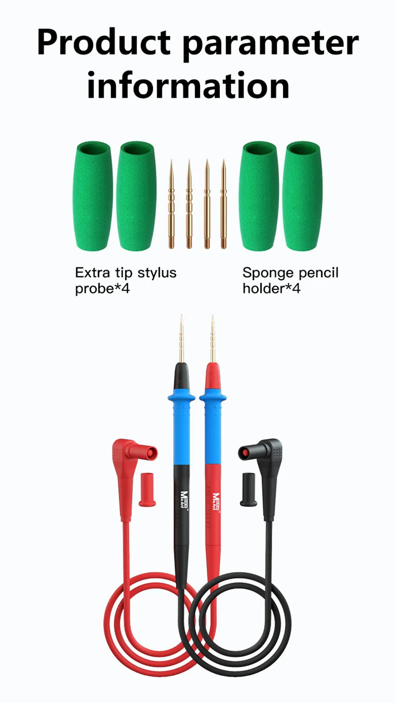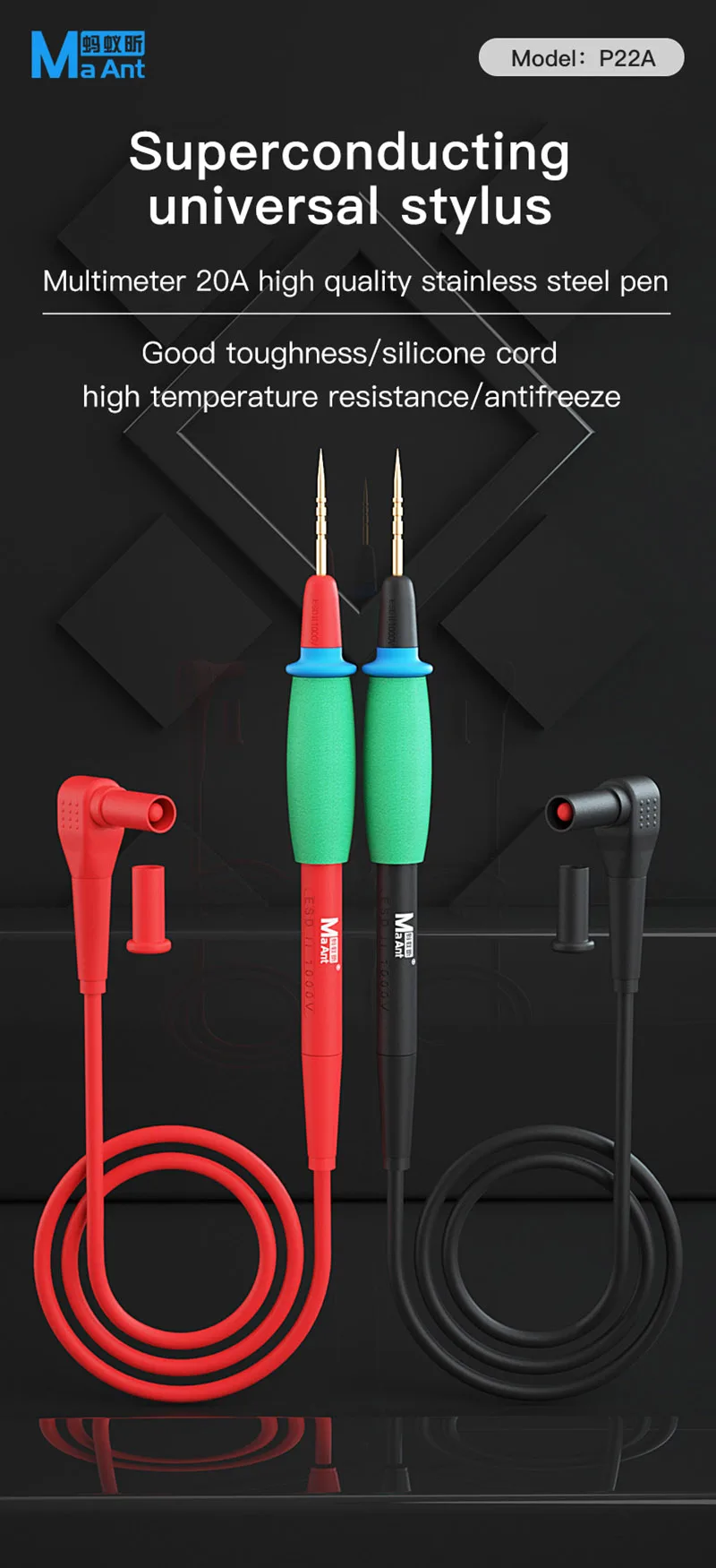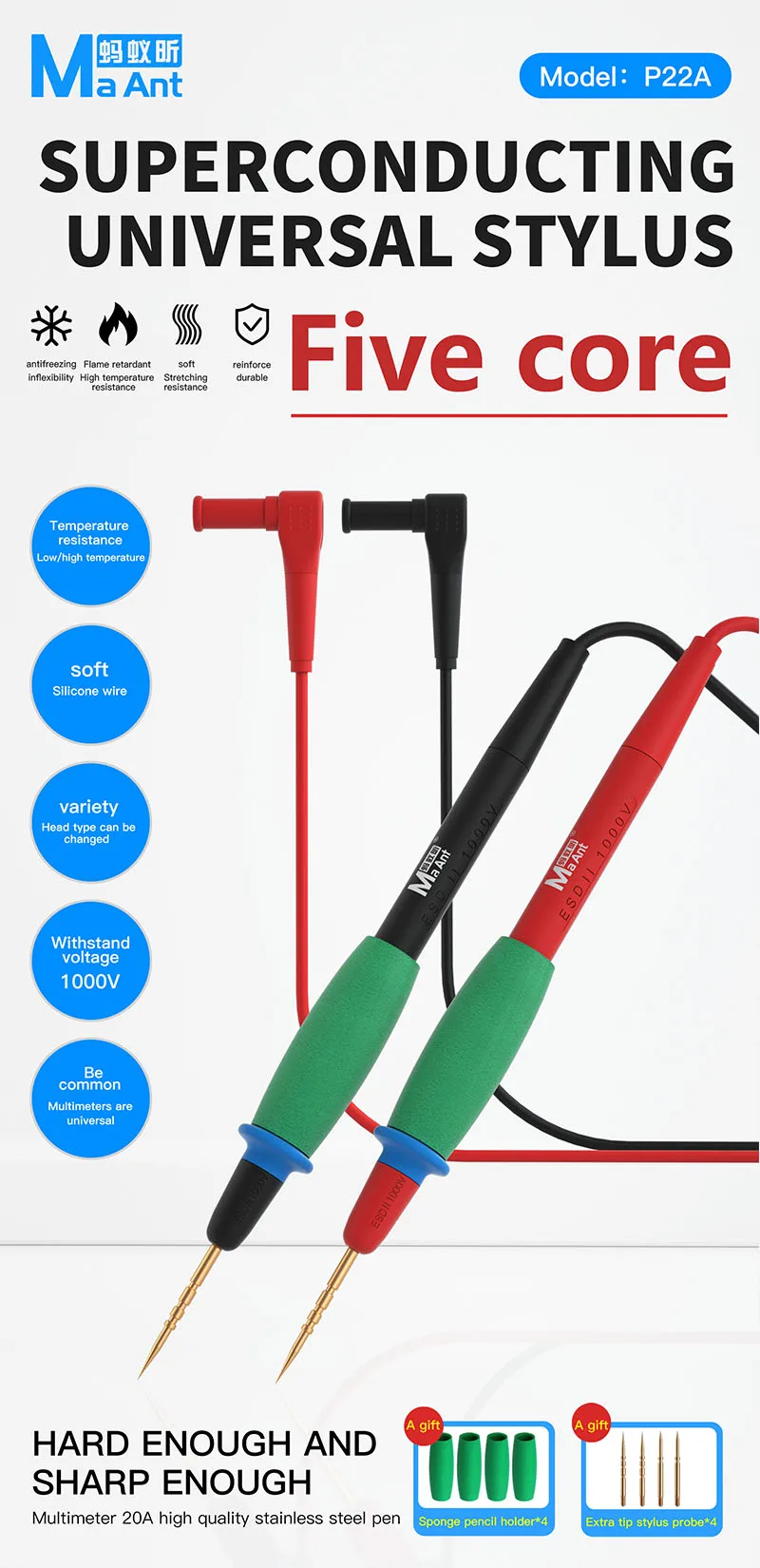 Cables de prueba superconductores universales MaAnt P22A 20A, alta dureza, resistencia a altas temperaturas, Extra multímetro de punta, sonda Stylus