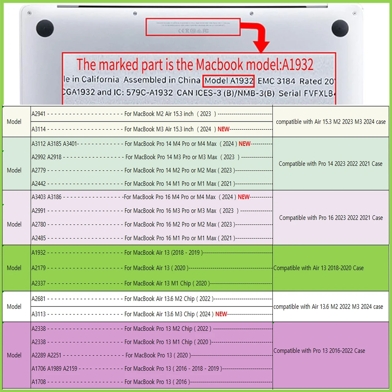 ¡! Por favor, lea atentamente, ¡es muy importante!Confirme el tamaño del ordenador antes de comprarlo. ¿Puede encontrar A1 * en la parte posterior de la computadora?, luego compre el tamaño correspondiente correctamente, o comuníquese con el servicio al cliente, pueden ayudarlo a encontrar rápidamente el tamaño correcto★2023 --- MacBook M2 M3 Air 15,3 pulgadas★----------- A2941 A3114★★2023 --- MacBook Pro 14 M3 Pro o M3 Max★----------- A2992 A2918★★2023 --- MacBook Pro 14 M2 Pro o M2 Max★------------ A2779★2021 ------ MacBook Pro 14 M1 Pro o M1 Max -------------- A2442★2023 --- MacBook Pro 16 M3 Pro o M3 Max★------------ A2991★★2023 --- MacBook Pro 16 M2 Pro o M2 Max★------------ A2780★2021 ------ MacBook Pro 16 M1 Pro o M1 Max -------------- A24852022 2020 MacBook Pro 13 M2/M1 Chip A23382020 ------ MacBook Pro 13 Intel Atom A2289 A22512016 ~ 2019 MacBook Pro 13 ---------------------------------- A1706 A1989 A21592016 ------ MacBook Pro 13 ---------------------------------------- A17082012 ~ 2017 MacBook Air 13 ------------------------------------- A1369 A14662018 2019 2020 MacBook Air 13 -------------------------------- A1932 A2179 A23372022 ------ MacBook Air 13,6 M2 M3 Chip A2681 A3113