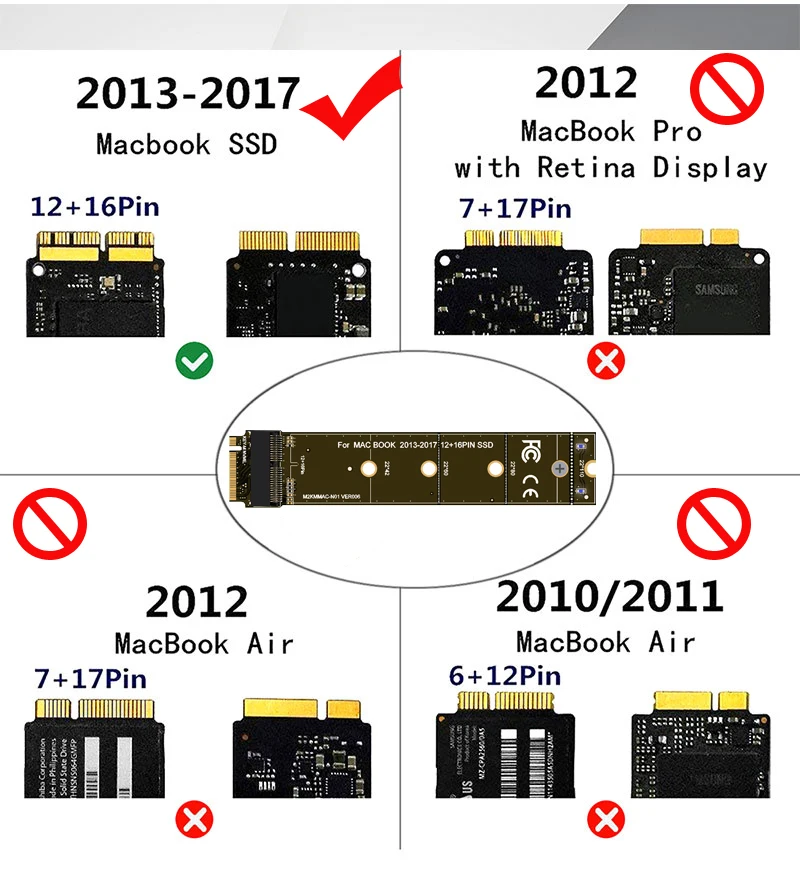 1 adaptador SSD M.2 KEY-M a Macbook 2013-2017 de 12+6 pines (SSD NO incluido)