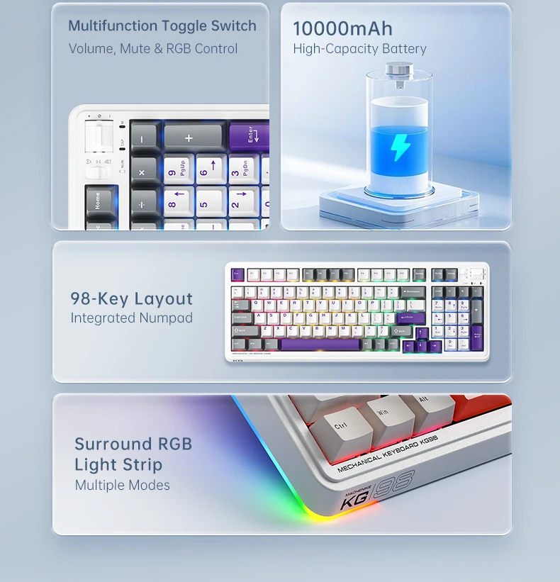 Intercambiables en caliente e interruptores: Admite intercambio en caliente de teclas completas.Disponible con GR Silver Switch, Purple-Gold Switch, Kailh Deep Blue Switch y Kailh Ice Cream Switch, que satisfacen diferentes necesidades de escritura y juego.