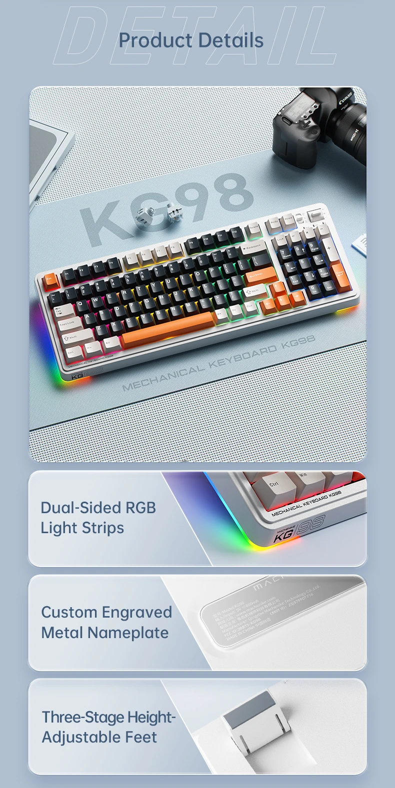 Iluminación y detalles: La tira de luz RGB envolvente admite múltiples efectos de iluminación. Viene con placa de identificación de metal personalizada, pies de altura ajustable de 3 niveles y otros diseños detallados para mejorar la experiencia y la personalización del usuario.