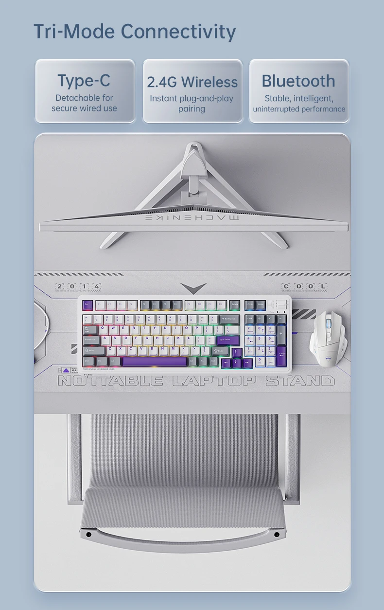 Conexión: Admite conexión tipo C, inalámbrica 2,4G y Bluetooth de tres modos.Equipado con estabilizadores sintonizados de tercera generación, que garantizan un rendimiento suave y estable para teclas grandes.