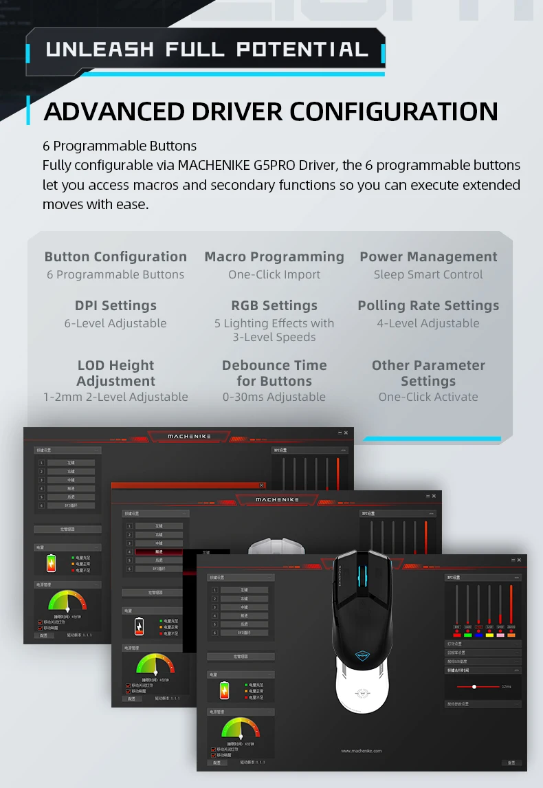 Fully configurable via MACHENIKE G5PRO Driver, the 6 programmable buttons let you access macros and secondary functions so you can execute extended moves with ease.