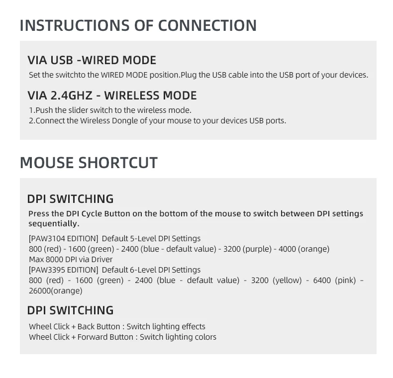 8000 DPI Max , 45 ips , 15g Acceleration (PAW3104)