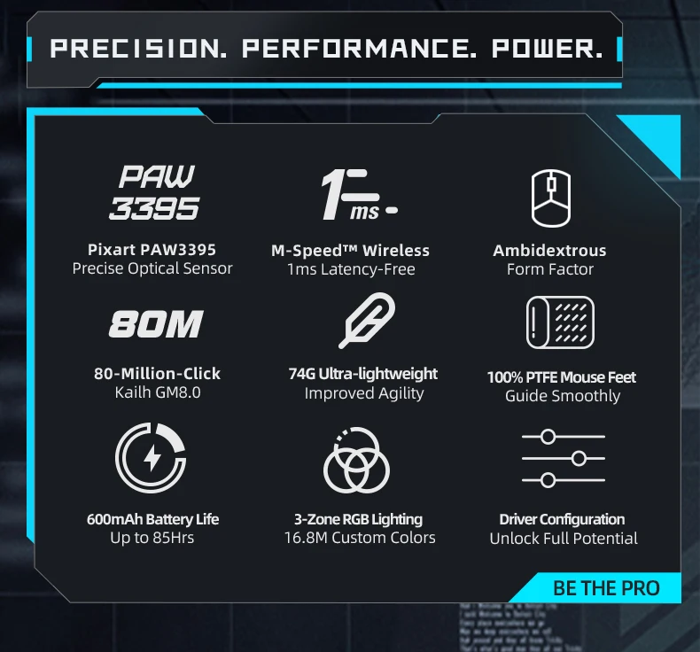 - 26,000 dpi , 650 ips optical sensor, and 1000 Hz polling rate(PAW3395).