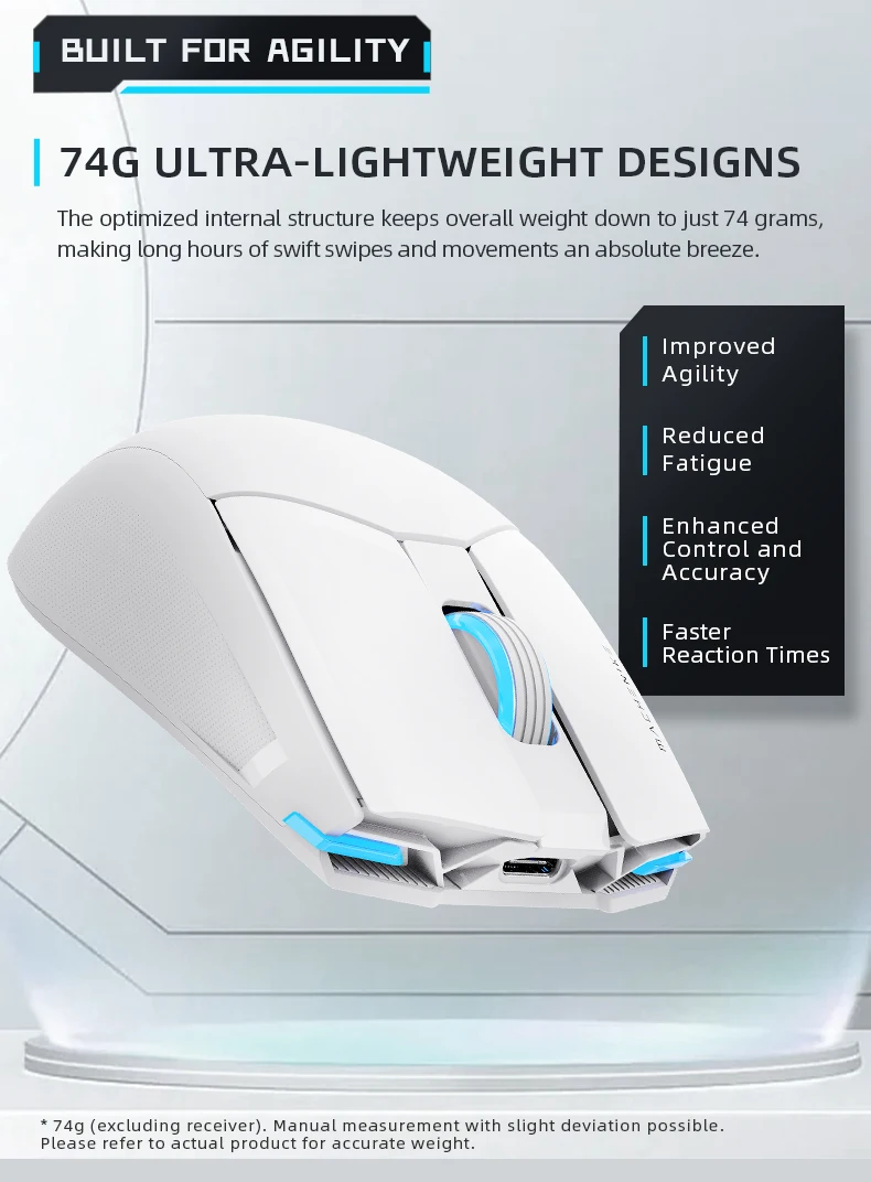 The optimized internal structure keeps overall weight down to just 74 grams, making long hours of swift swipes and movements an absolute breeze.