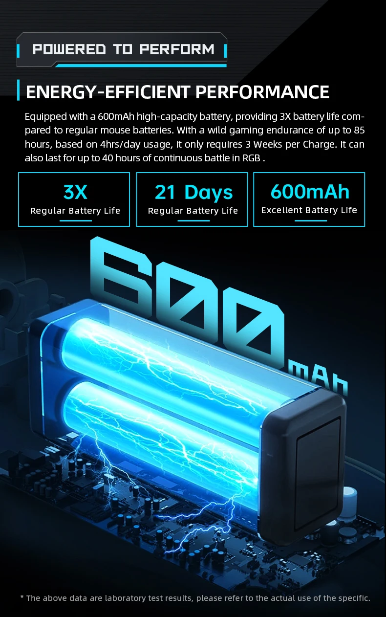 Equipped with a 600mAh high-capacity battery, providing 3X battery life compared to regular mouse batteries. With a wild gaming endurance of up to 85 hours, based on 4hrs/day usage, it only requires 3 Weeks per Charge. It can also last for up to 40 hours of continuous battle in RGB .