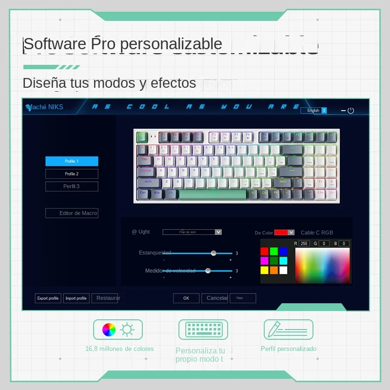 El K500 cuenta con iluminación RGB con 16,8 millones de colores LED, puede descargar efectos de iluminación adicionales a la biblioteca y usarlos fácilmente a través del controlador de efectos de iluminación