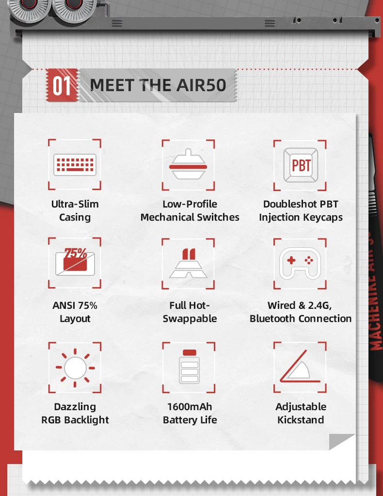 Gracias a la carcasa ultrafina y las teclas PBT junto con los últimos interruptores mecánicos de perfil bajo MACHENIKExOUTEMU, el grosor del Air50 oscila entre 15 mm y 25 mm, siendo la parte más delgada que es de solo 15 mm.