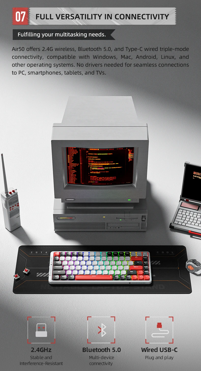 Air50 ofrece conectividad de modo triple con cable 2.4G, Bluetooth 5.0 y tipo C, compatible con Windows, Mac, Android, Linux y otros sistemas operativos.No se necesitan controladores para conexiones perfectas a PC, teléfonos inteligentes, tabletas y televisores.