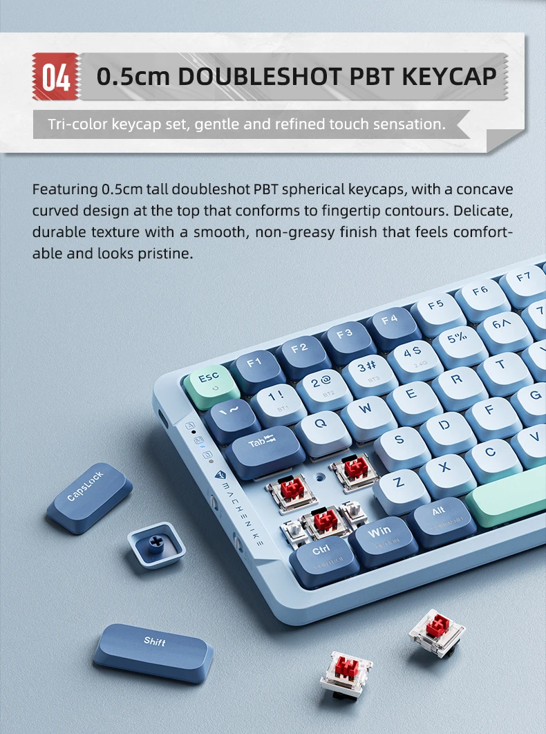 Con teclas esféricas PBT de doble disparo de 0,5 cm de alto, con un diseño curvo cóncavo en la parte superior que se adapta a los contornos de la punta de los dedos.Textura delicada y duradera con un acabado suave y no graso que se siente cómodo y luce impecable.