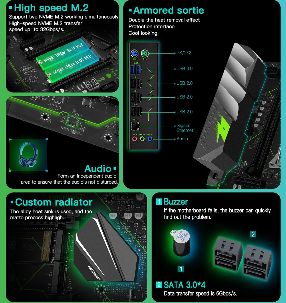 Interfaz: 1 * RJ45/1 * PS2/4 * SATA2.0/2 * SATA3.0/6 * USB2.0/2 * USB3.0/2 * PCI-E x16/1 * PCI-E X1/1 * PCI-E X4/1 * Interfaz NVME/NGFF M.2;