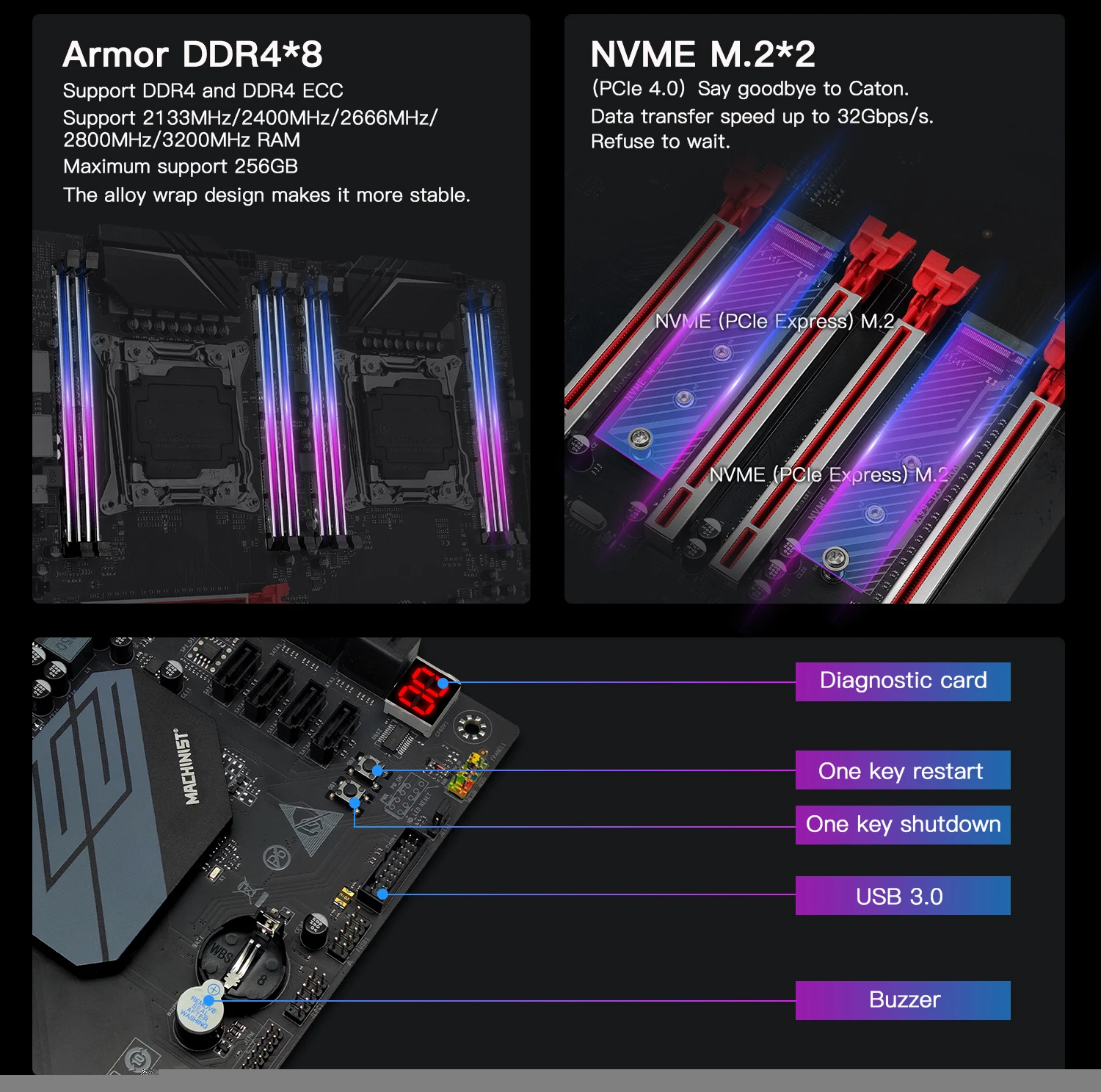Comprar MACHINIST-Kit de placa base X99 Dual CPU, Combo de LGA2011-3 Xeon E5 2696 V3 CPU * 2 DDR4 RAM 8*16G = 128GB 2133MHz, Memoria NEME M.2 D8 MAX