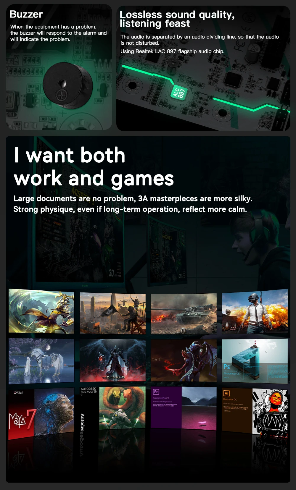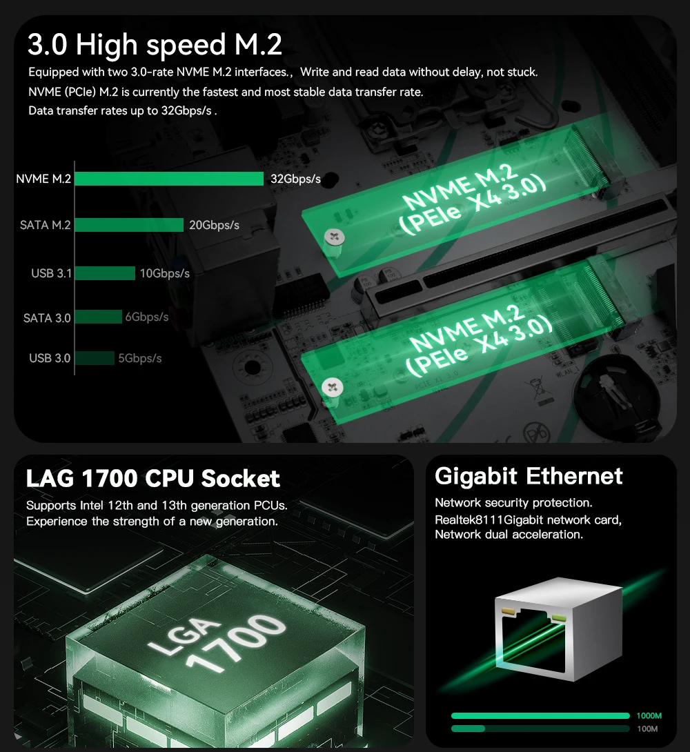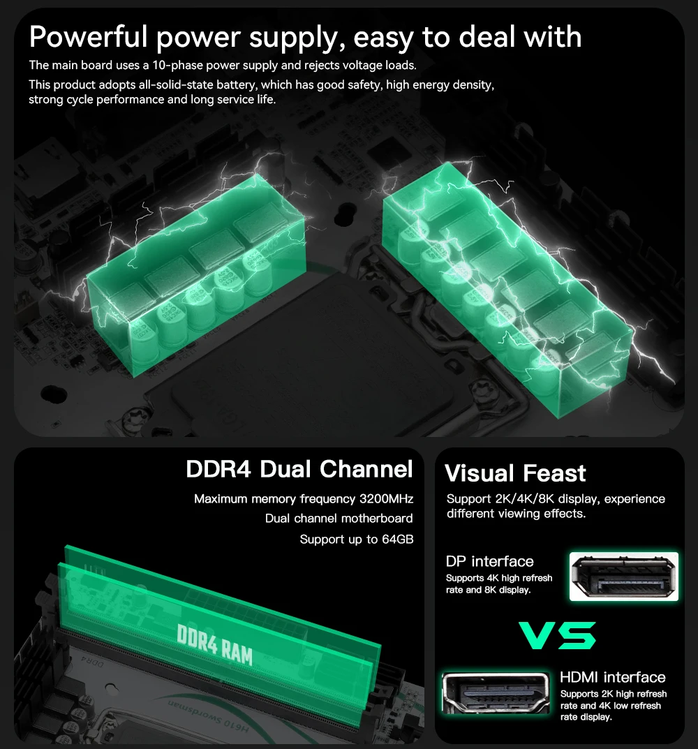Compatible con la ranura de memoria de doble canal DDR4: compatible con 2133/2400/2666/3000/3200 MHZ, la capacidad máxima de 64G.