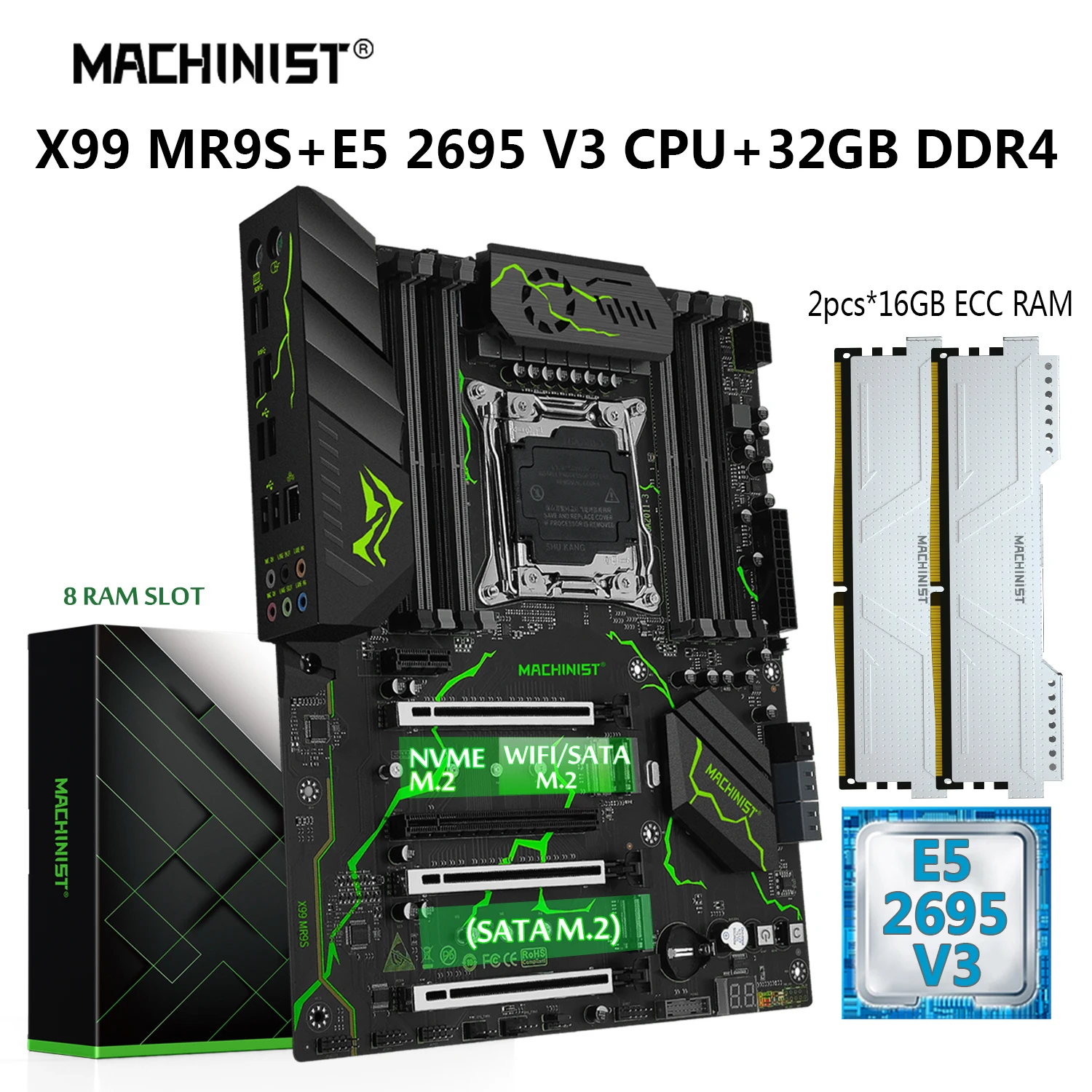 Comprar MACHINIST-placa base MR9S X99, combo LGA 2011-3 Xeon E5 2695 V3, Kit de CPU, procesador 2x16GB DDR4 RAM ECC memoria SSD NVME M.2 SATA