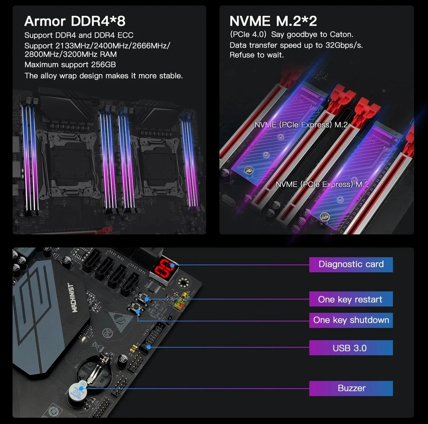▲Admite ranura de memoria de cuatro canales DDR4 de alta velocidad: compatible con 2133/2400/2666/3000/MHz 3200, soporte máximo de memoria 256G