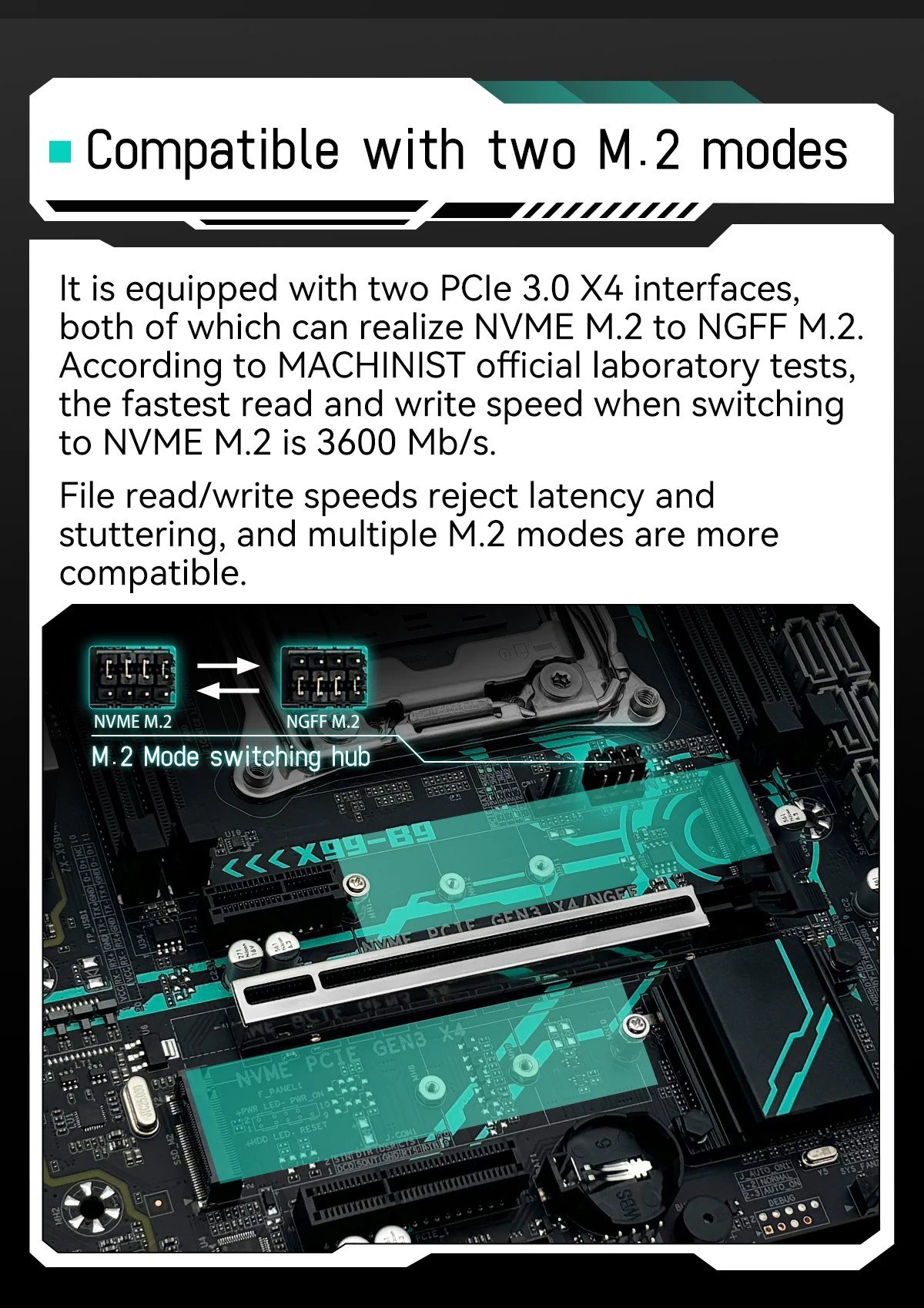 El modo NVMe M.2 es el estándar PCIe 3.0x4, con la velocidad de lectura y escritura más rápida de hasta 3600 M/S.