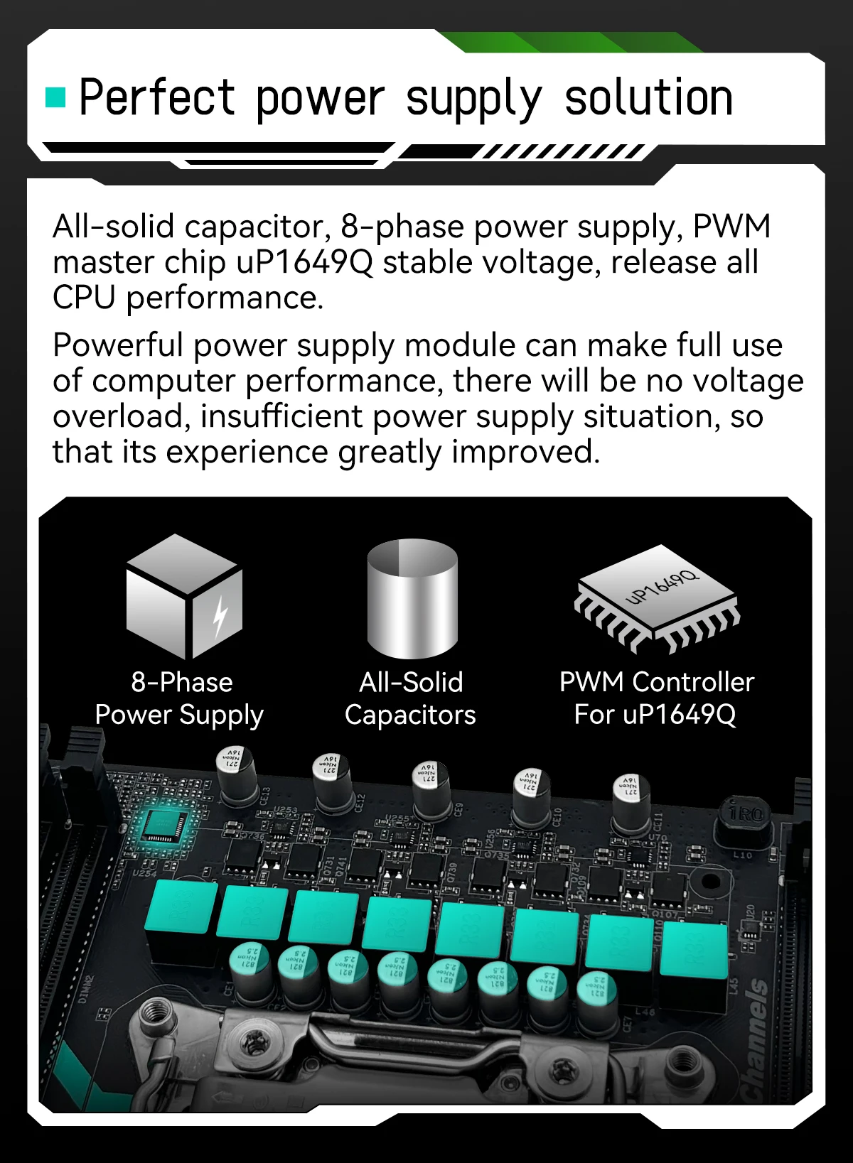 Fuente de alimentación: fuente de alimentación de 8 fases (4 fases), el controlador PWM es uP1649Q, cada tubo MOS de fuente de alimentación de fase es uno arriba y otro abajo, ¡un total de 16 tubos MOS!