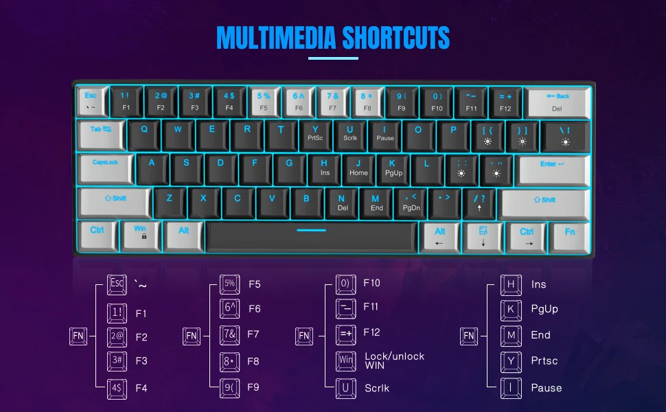【Solid Sea Blue Color Backlit And 19 Mode Backlight】MageGee 61 keys mechanical gaming keyboard key light has 19 backlight operation modes (Fn2+|(Light Switching); The light can also be turned off if you don’t need lighting. The double-shot injection molded keycaps provide elegant and clear uniform backlighting without glare.
