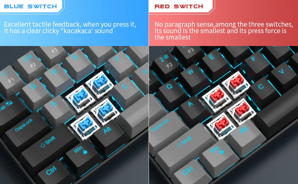 【Select The Required Switch And Wide Compatibility】 The Blue Switch offers a quicker and springier response, crisp click sound for spring typing enjoyment. The Red Switch quiet resistance feedback is perfect for work typing and a quiet gaming place. MageGee 60 mechanical keyboard is compatible for Windows 2000/XP/Vista/7/8/10/Mac OS.