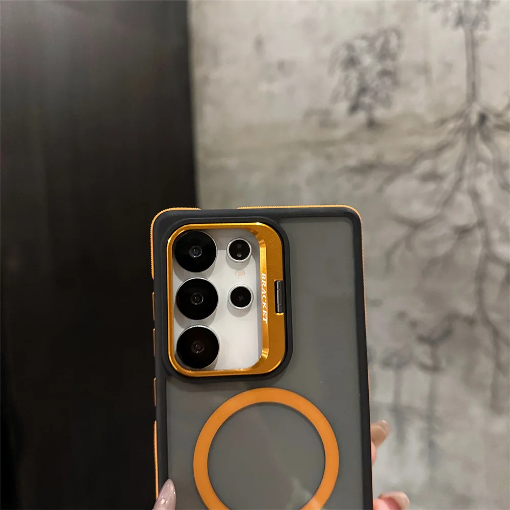 Para Magsafe-funda de teléfono con soporte de lente de armadura antideslizante para Samsung S25 S24 FE S23 Plus S22, cubierta transparente negra de carga Ultra inalámbrica