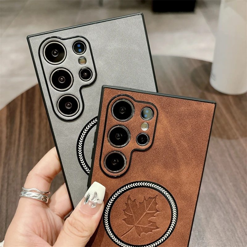 Comprar Magsafe Funda de cuero con patrón de hoja de ciervo para Samsung Galaxy S24 Ultra S23 FE S22 S21 Note 20, cubierta magnética de carga inalámbrica