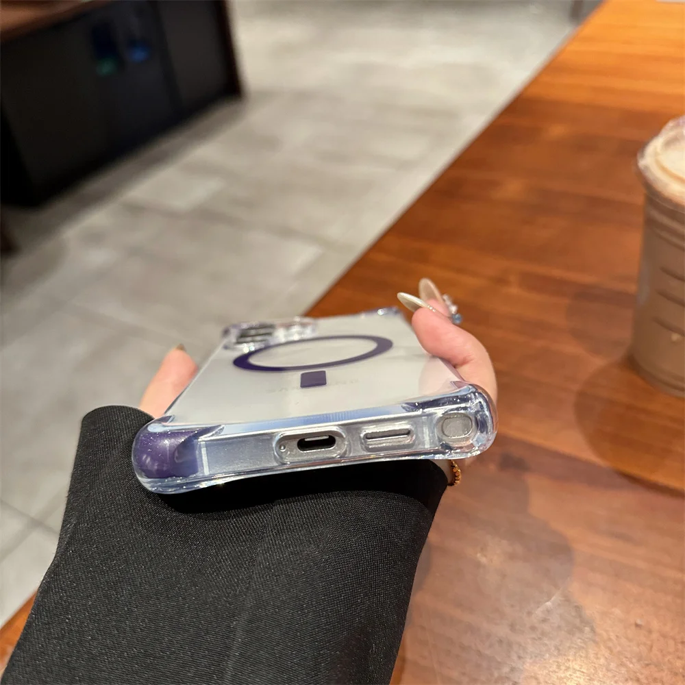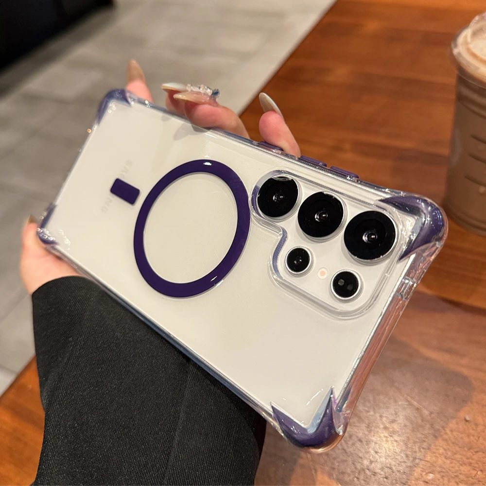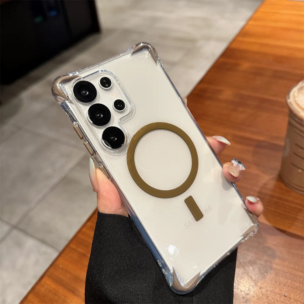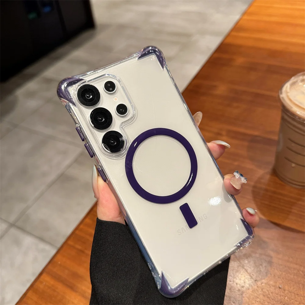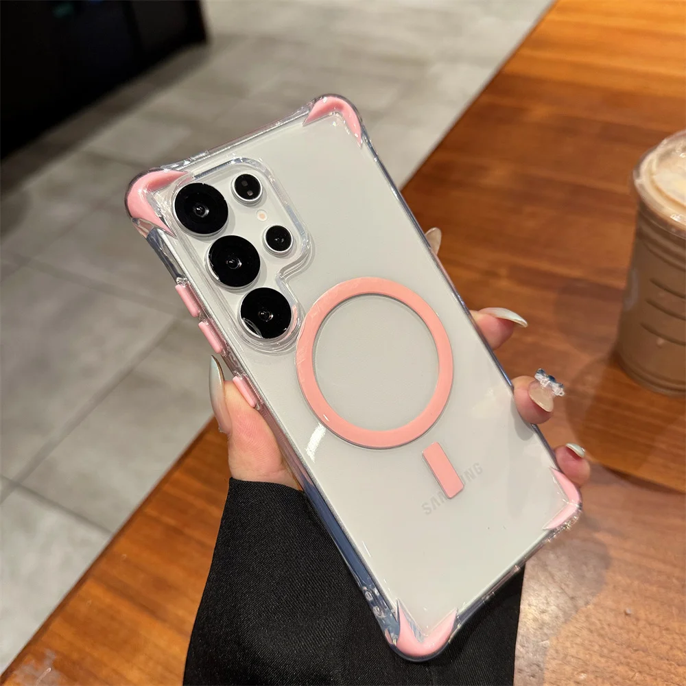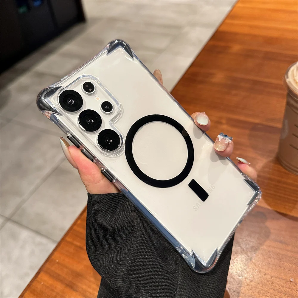 Para Magsafe funda de teléfono magnética transparente para Samsung S24 S25 Ultra Plus carga inalámbrica cuatro esquinas tapas protectoras anticaída