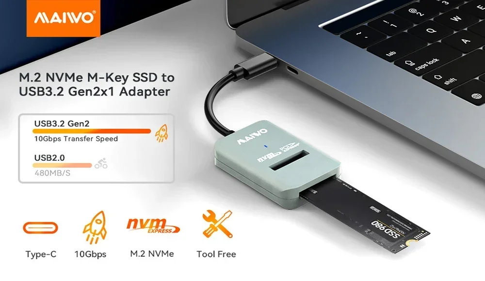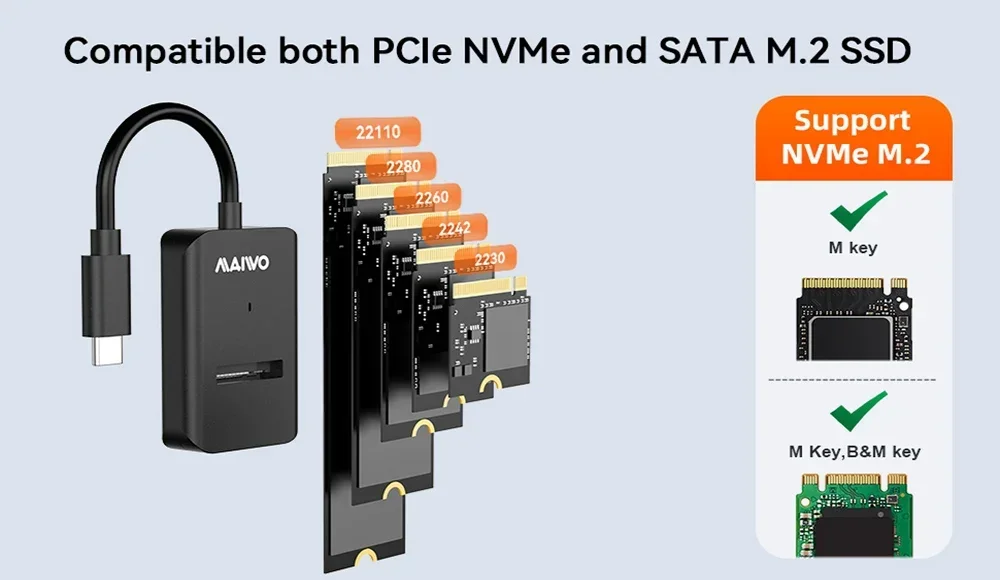 Este adaptador SSD M.2 NVME admite SSD NVMe M.2 con clave M en todo tipo de tamaños: 2230/2242/2260/2280/22110 hasta 4 TB de capacidad, acceda rápidamente a su SSD