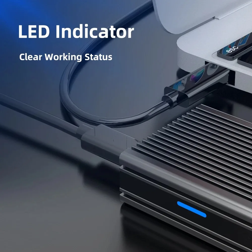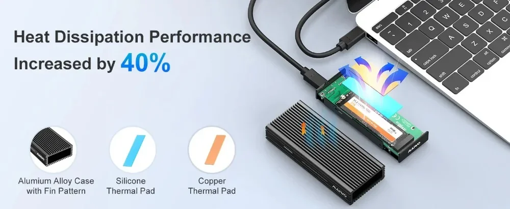 【Excelente disipación de calor】Este adaptador NVMe M.2 a USB C tiene una carcasa de aleación de aluminio con patrón de aletas y dos almohadillas térmicas que proporcionan una excelente disipación de calor.