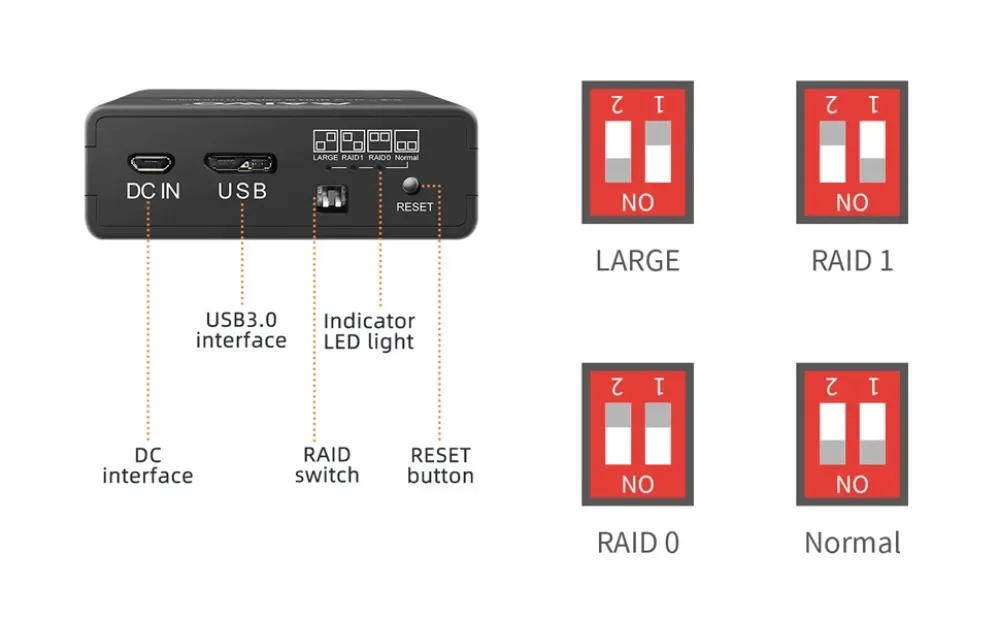 Supports simultaneous reading and writing of two 6TB 2.5-inch SATA hard drives, with a maximum capacity expansion of 12TB.