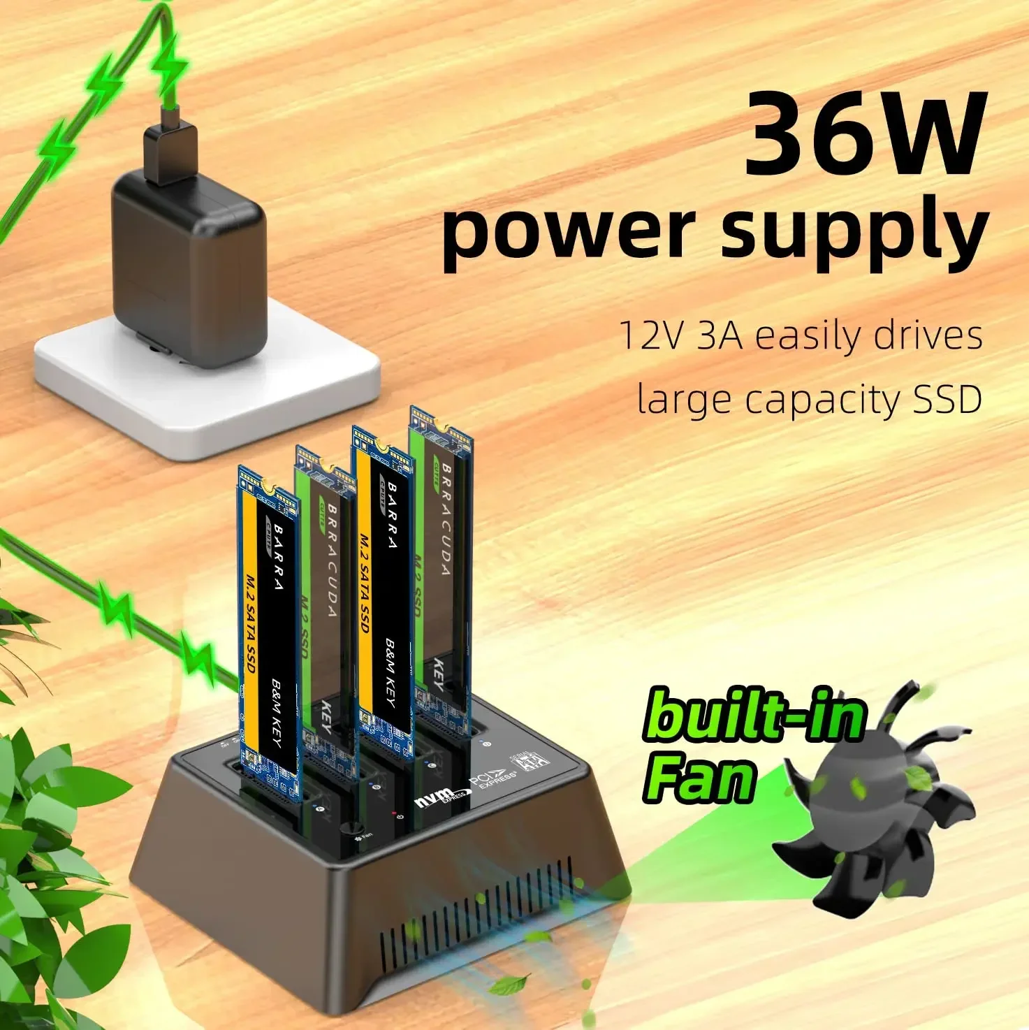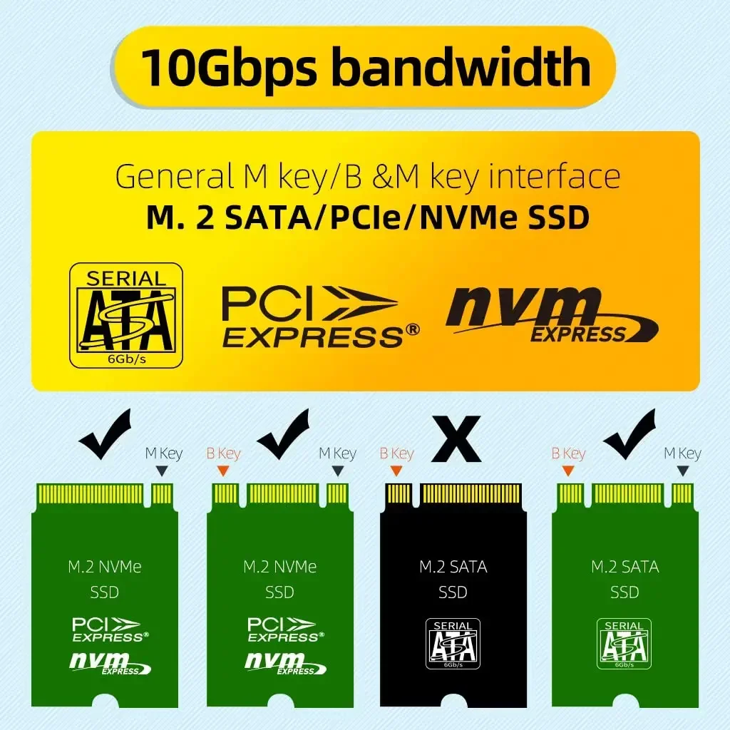 NVME/SATA SSD simultáneamente compatible: admite la mayoría de los SSD M.2 NVME SATA B+M key/M key.Plug and play, no se necesitan controladores.Admite cuatro discos duros SSD M.2 de 6 TB.