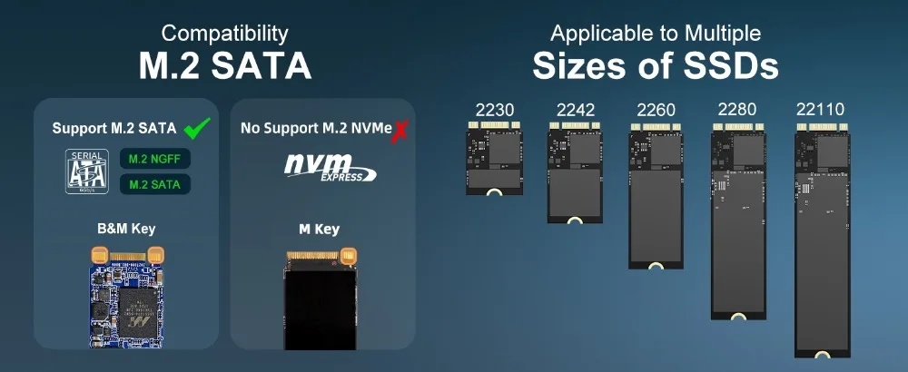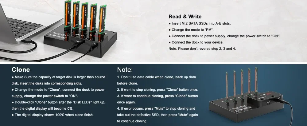 【Compatibilidad】Esta estación de acoplamiento m.2 de 5 bahías solo admite SSD M.2 SATA/NGFF en tamaño 2230/2242/2260/2280/22110.