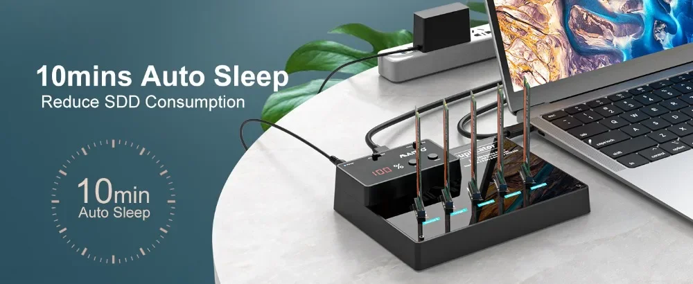 【Gran capacidad de 10 TB】Esta base de unidad múltiple admite 5 unidades de estado sólido de 2 TB, hasta 10 TB de almacenamiento de datos.La función de suspensión automática de 10 minutos ayuda a proteger bien los discos duros, reducir la pérdida de los conductos y aumentar la vida útil de los conductos.