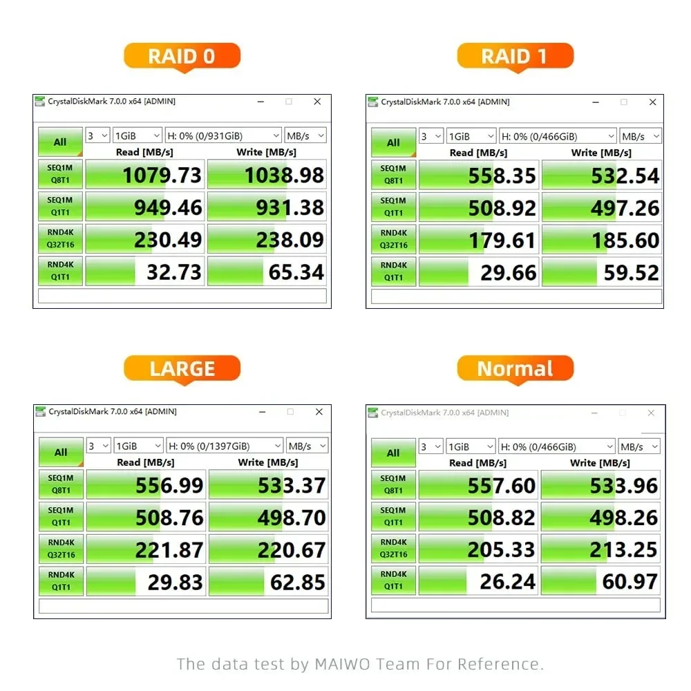 RAID 1: dos HDD en la carcasa del HDD pueden hacer una copia de seguridad entre sí, no pueden mejorar su rendimiento (velocidad de lectura y escritura), y puede admitir la función de autorrestauración (los modos RAID 0 no pueden admitir esta función), lo que hace que los archivos se puedan restaurar cuando se producen errores y fallas.