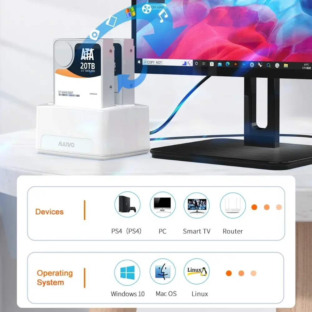 Esta estación de acoplamiento es compatible con HDD/SSD de 2,5 o 3,5 pulgadas de hasta 20 TB por bahía, proporciona una forma más conveniente de transmitir datos entre su disco duro y su computadora a través de un puerto USB disponible.