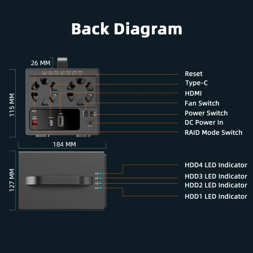 【Cuerpo Unibody de aleación de aluminio y doble disipación de calor】: Los recintos de transmisión de 4 bahías con Raid cuentan con un ventilador de doble fila de aleación de aluminio Unibody, la energía eólica se puede cambiar a 2 niveles, buena en disipación de calor, que es firme y confiable, El proceso de convección forzada ayuda a acelerar la circulación de aire y la ventilación de calor para enfriar eficazmente la unidad y todo el sistema para un funcionamiento estable y una vida útil prolongada.