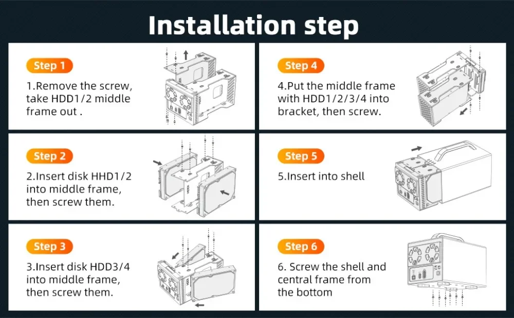 Funciona de maravilla, todos los tornillos están incluidos junto con la herramienta para el montaje. Probado en RAID con 4 discos para un total de +-10TB utilizables, instalado bajo Linux y funciona de maravilla. En pruebas, usando solo USB 3.1, obtengo +-380MB/sec y voy a conectarlo en USB 3.2 para ver, pero estoy esperando un cable más largo. El manual no es súper claro, pero es suficiente si estás familiarizado con los gabinetes RAID/JBOD. Los ventiladores son silenciosos, incluso a máxima potencia. Dos pequeñas quejas: 1/ los "caddies" para los discos son un poco plásticos y dan la impresión de que se romperán al instalarlos, 2/ tarda bastante en inicializarse durante la creación del volumen RAID, pero en realidad son solo detalles.