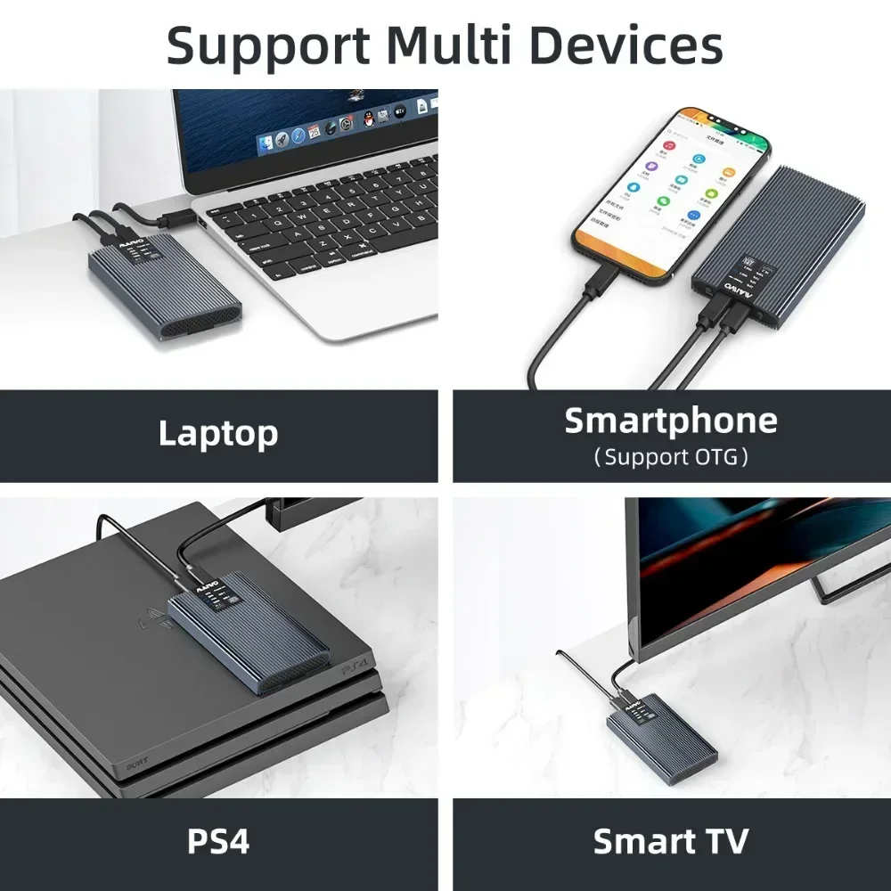 【Eficiente disipación de calor】: Diseñado para la disipación de calor. Se utiliza la carcasa de aleación de aluminio y se agrega el disipador de calor de silicona para una disipación de calor eficiente y una transmisión de datos más estable durante mucho tiempo.