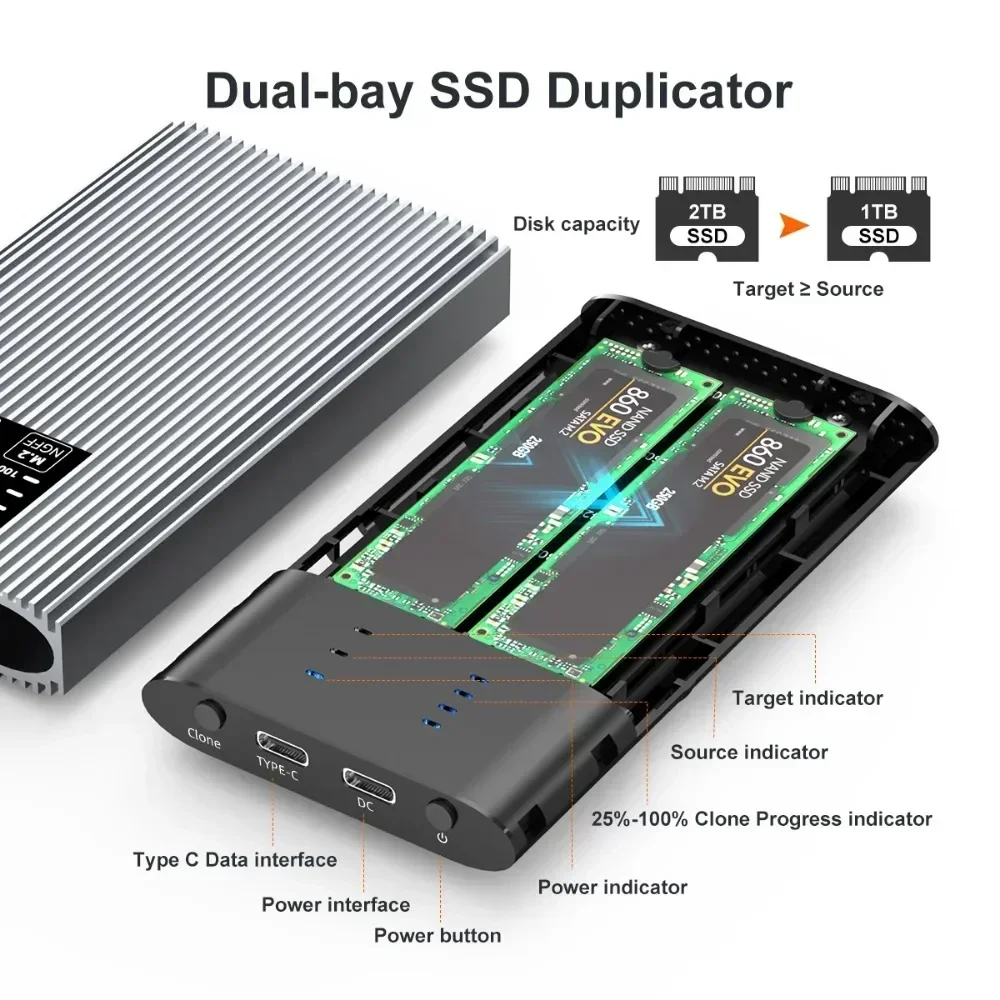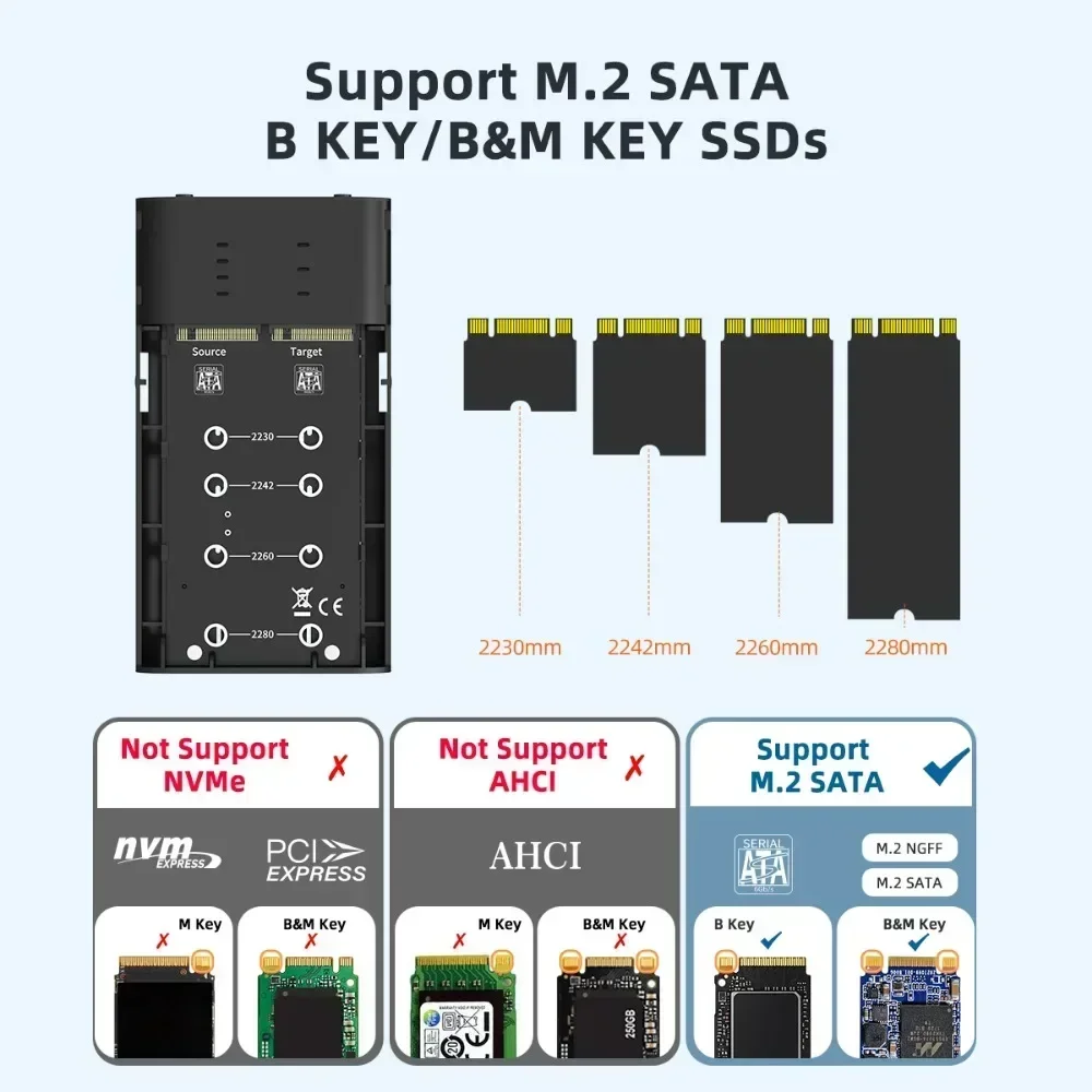 【CAJA PORTÁTIL DE protocolo dual】: Este duplicador externo M.2 para SSD SATA M.2 2242 2260 2280, admite 2 SSD SATA M.2 lee y escribe al mismo tiempo.