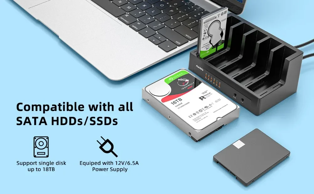Mejor diseño de disipación de calor y sin herramientas: con orificios de refrigeración, ventilador incorporado. Stock de disco duro con chip inteligente incorporado con el diseño de tipo abierto y móvil, el disco duro es más estable y tiene una mejor disipación del calor. Estación de acoplamiento SSD HDD sin herramientas, and Play Plug, no necesita controlador
