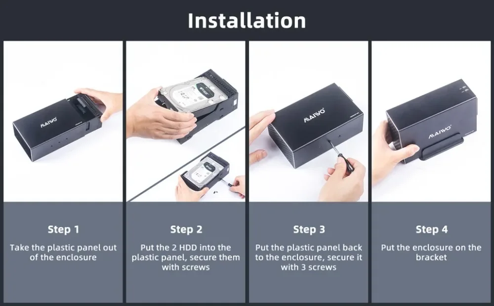 Amplia compatibilidad: esta carcasa HDD de 2 bahías es compatible con la unidad de disco duro SATA I II III de 2,5 y 3,5 pulgadas.Compatible con Windows/Mac OS/Linux.(Necesita un soporte de montaje adicional de 2,5 a 3,5 si se usa con HDD/SSD de 2,5'')