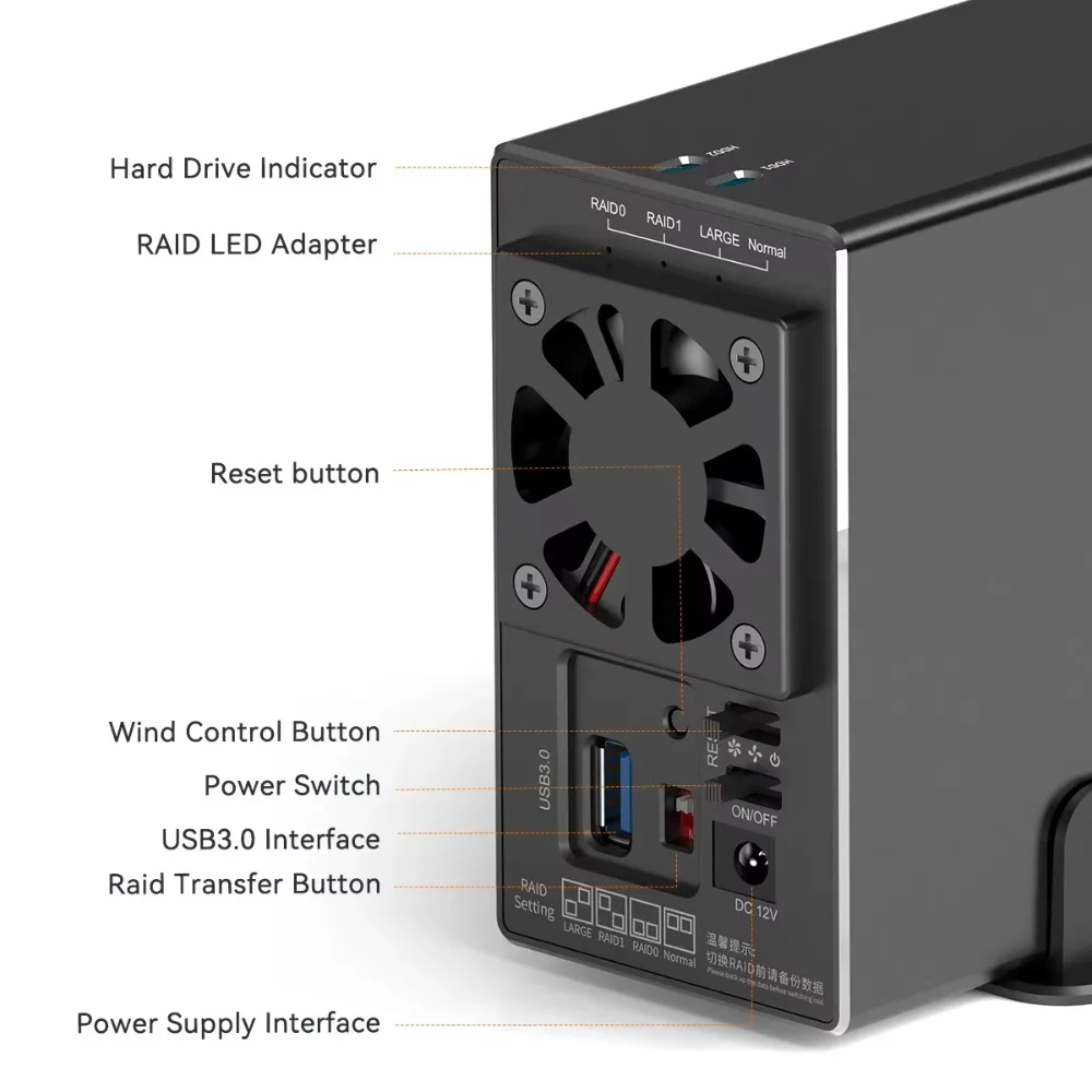 【Gran capacidad de 48 TB】El gabinete de almacenamiento de disco duro externo tiene 2 ranuras para unidades, cada ranura admite HDD SATA de 18 TB y 3,5 pulgadas, 48 TB de capacidad en total.