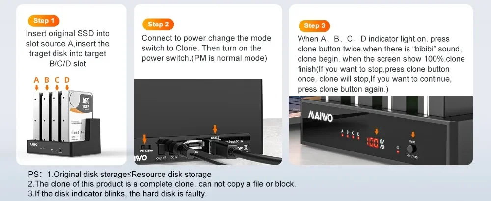 ●[0%-100% de visualización digital del estado de progreso de la clonación]: Cuando se completa la clonación de datos del compartimento de la unidad y se produce una excepción de clonación, sonará un pitido.La pantalla digital del porcentaje de progreso de la clonación ayuda a comprender el progreso para que puedas organizar mejor tu tiempo.