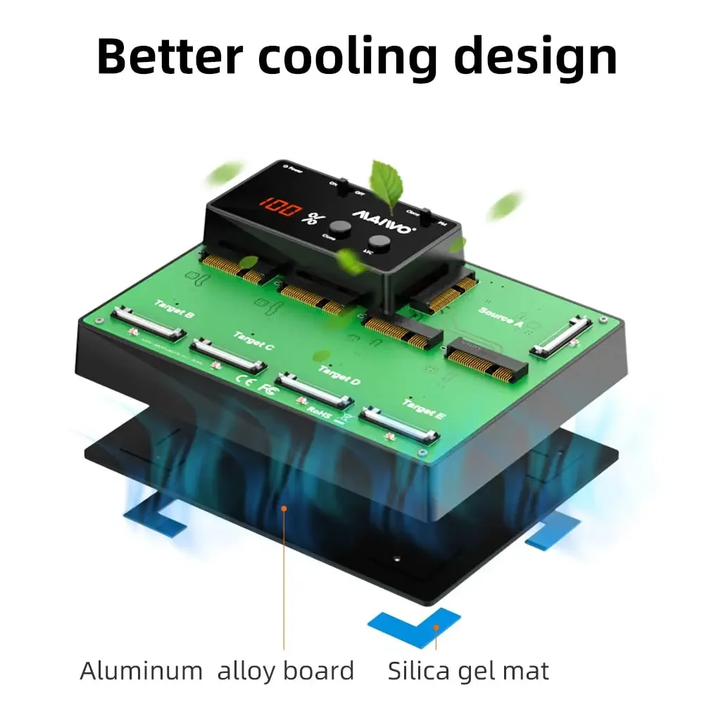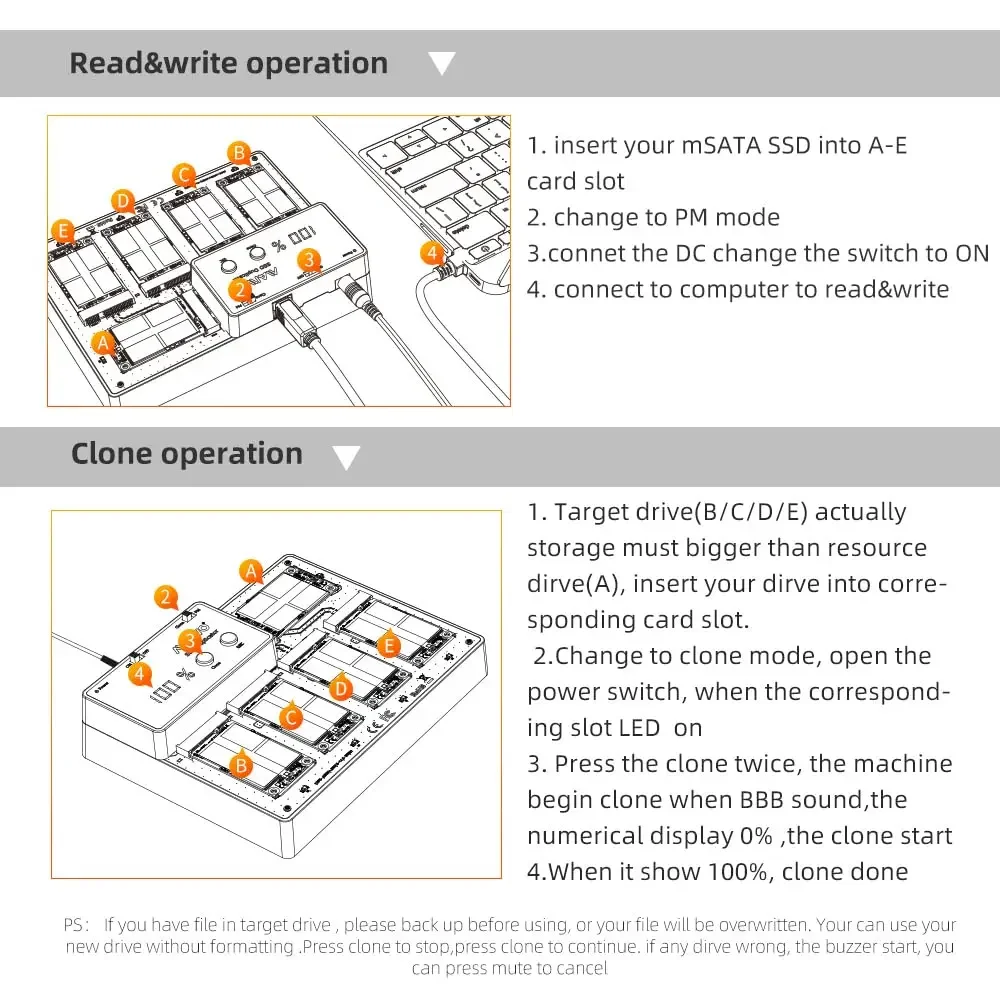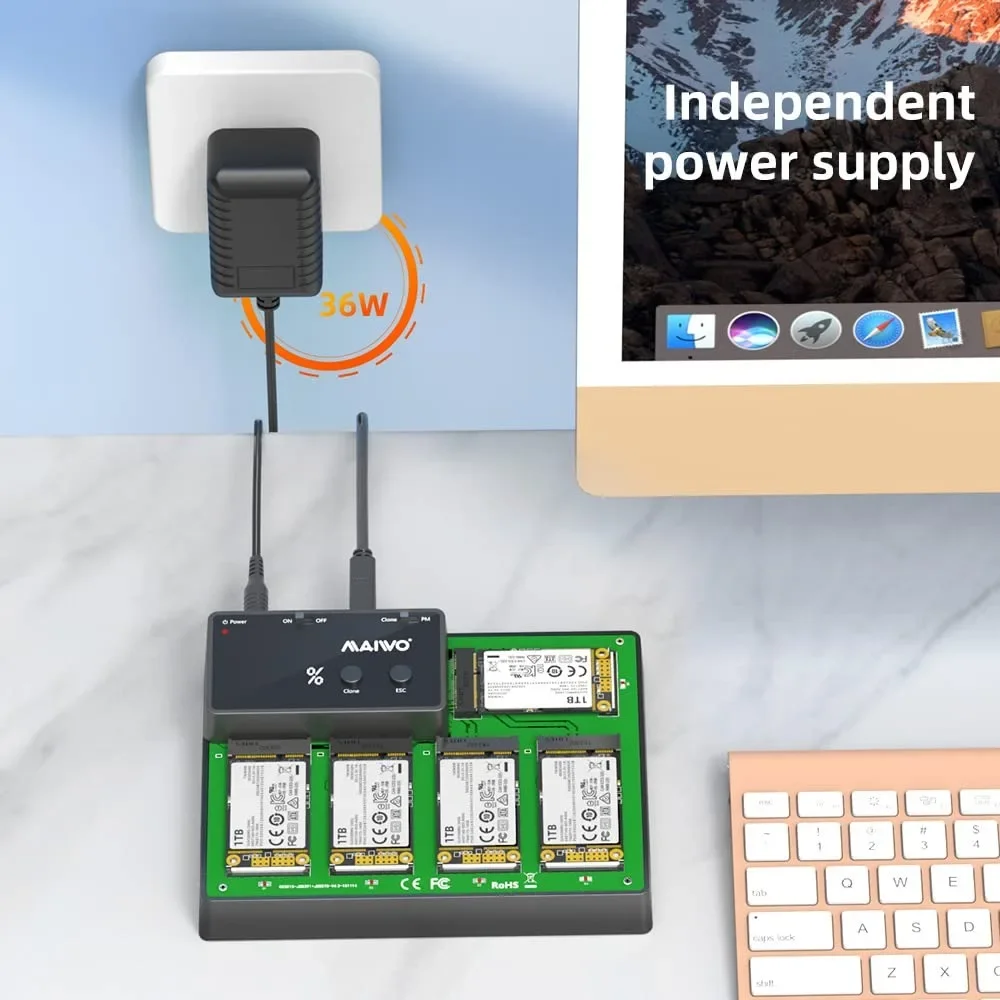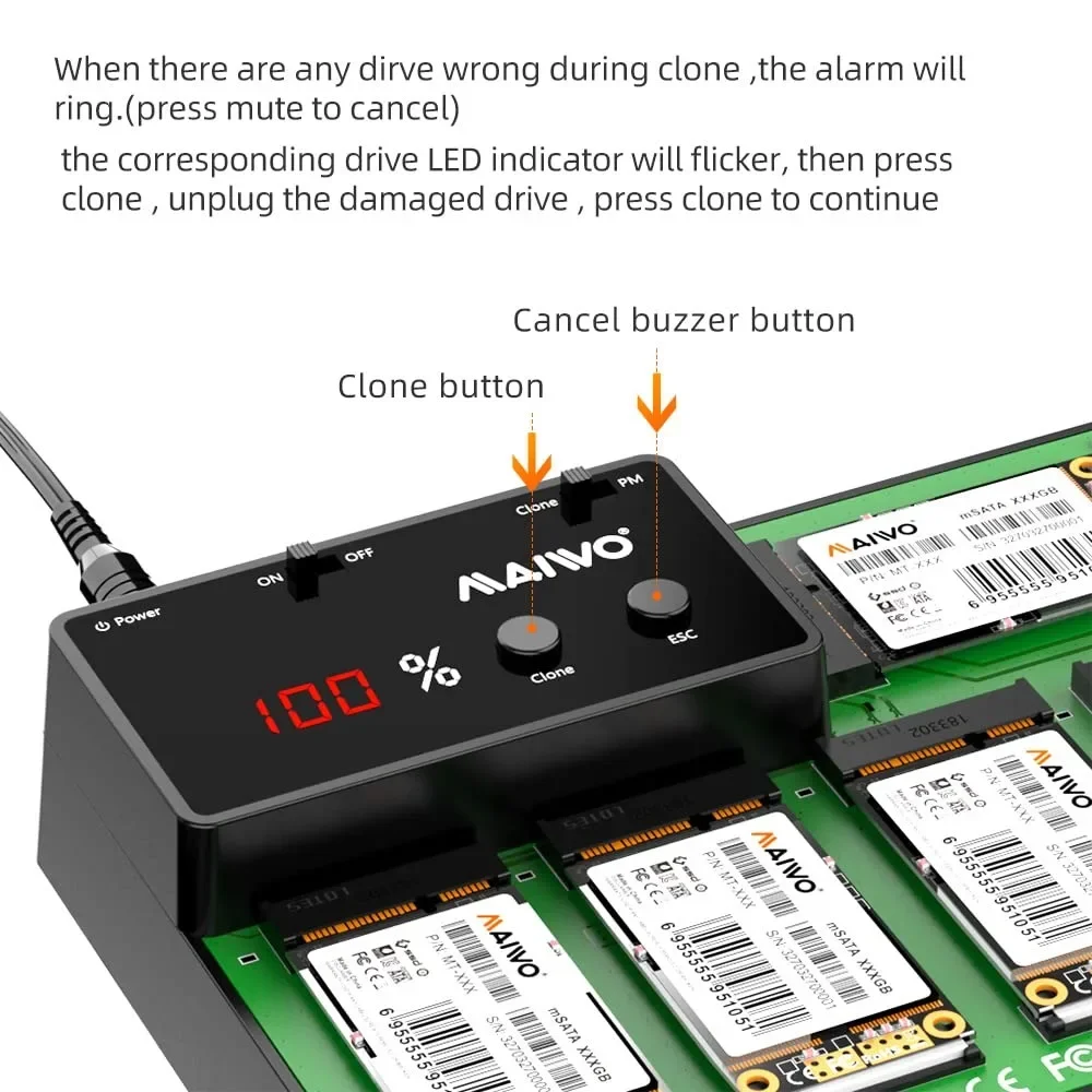Funcionalidad de clonación: Diseño de clonación de SSD mSATA de 1:4 M. No es necesario conectarse a un ordenador, simplemente conéctese a la fuente de alimentación, clonación sin conexión con un solo clic.